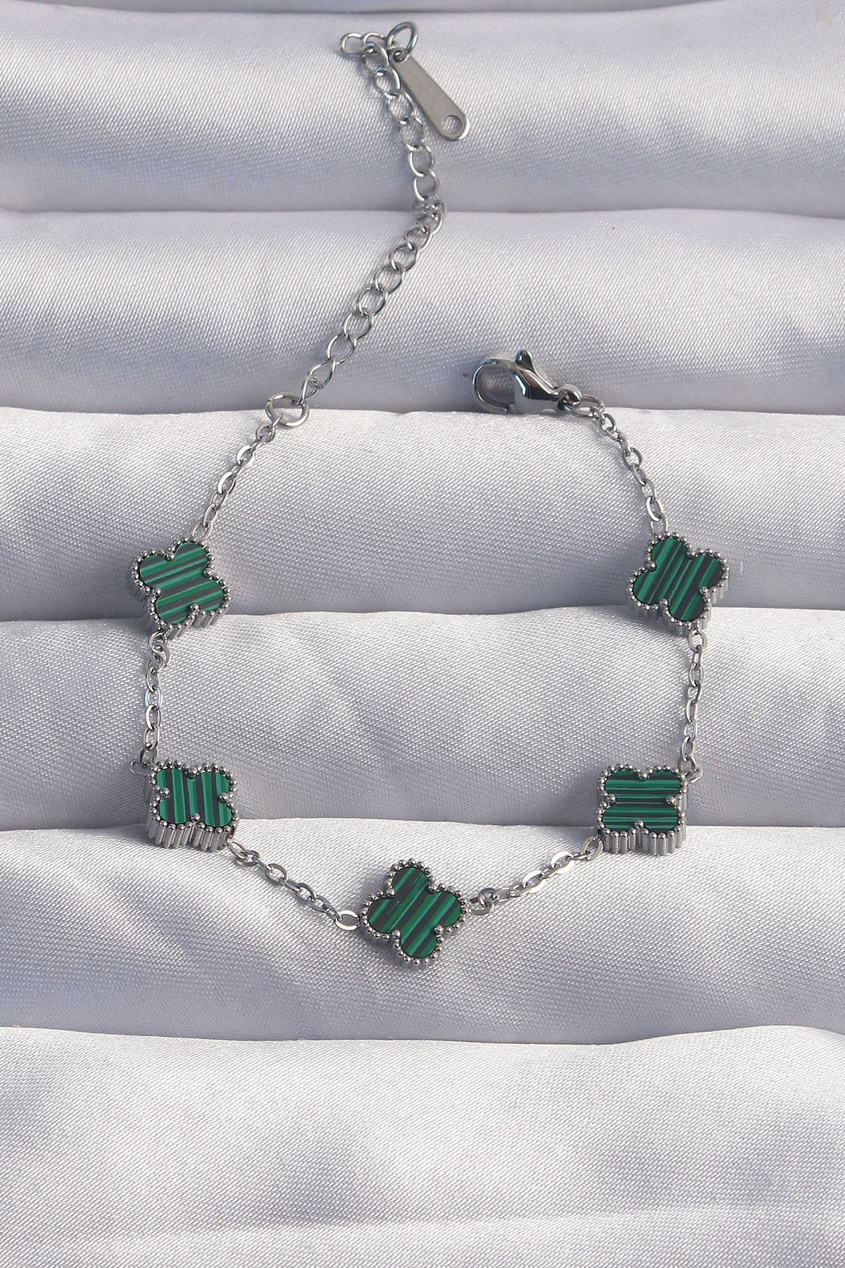 YRTCL 316L Çelik Baby Boy Gümüş Renk Çizgili Yeşil Mineli Yonca Bileklik