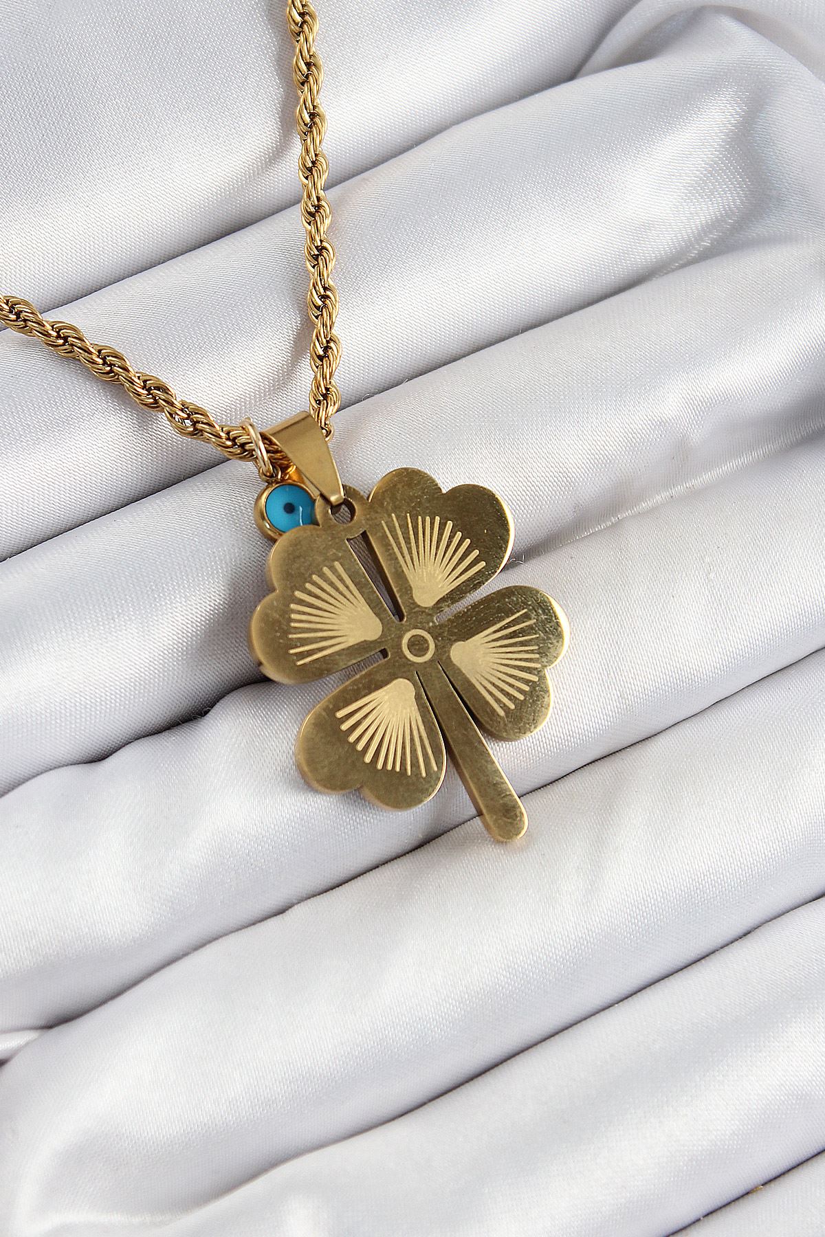 YRTCL 316L Çelik Burgu Zincirli Nazar Detaylı Yonca Model Gold Renk Kadın Kolye