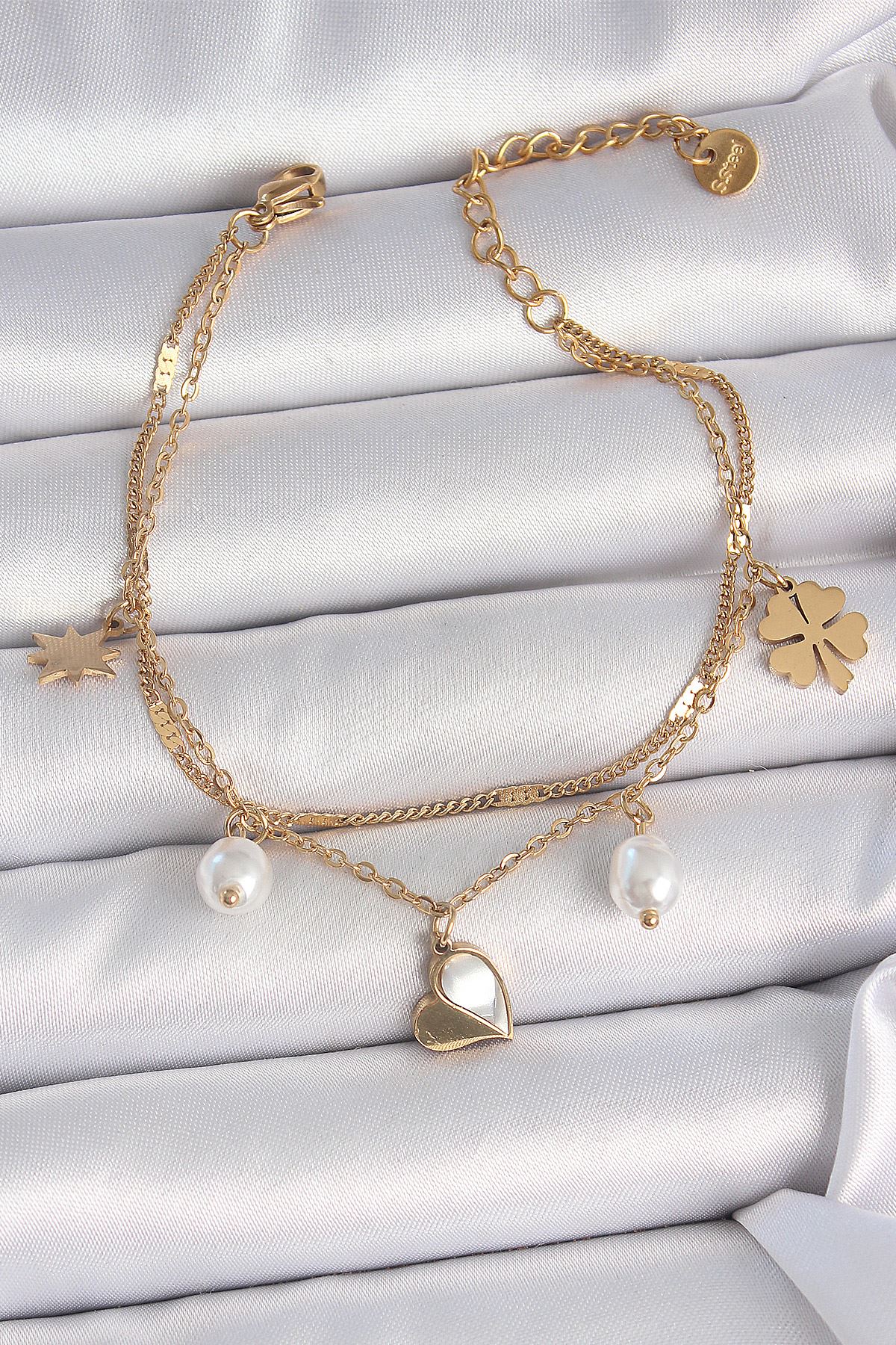 YRTCL 316L Çelik Gold Renk 2'li Zincir Model Sallantı Kalp Figür Yonca Detay Kadın Bileklik