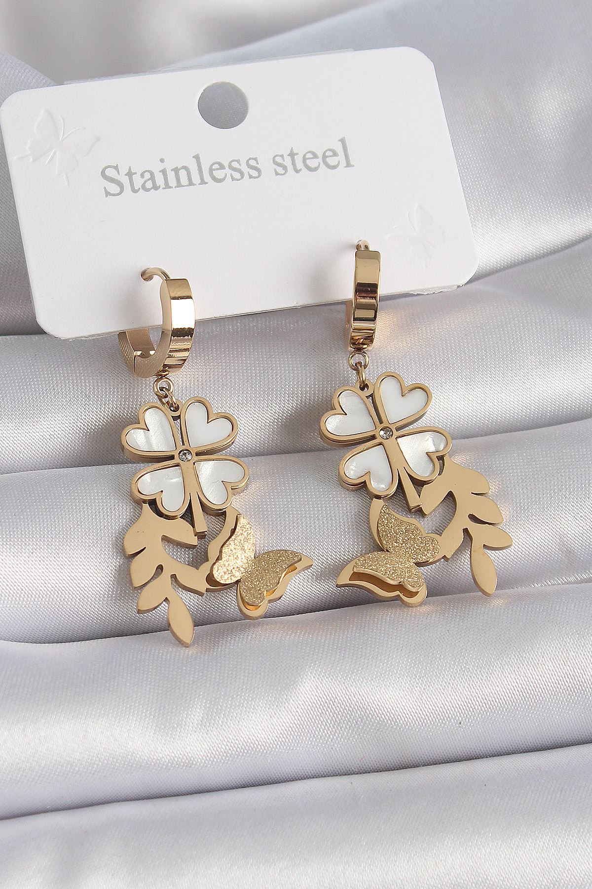 YRTCL 316L Çelik Gold Renk Beyaz Sedefli Yonca Simli Kelebek Figür Kadın Küpe