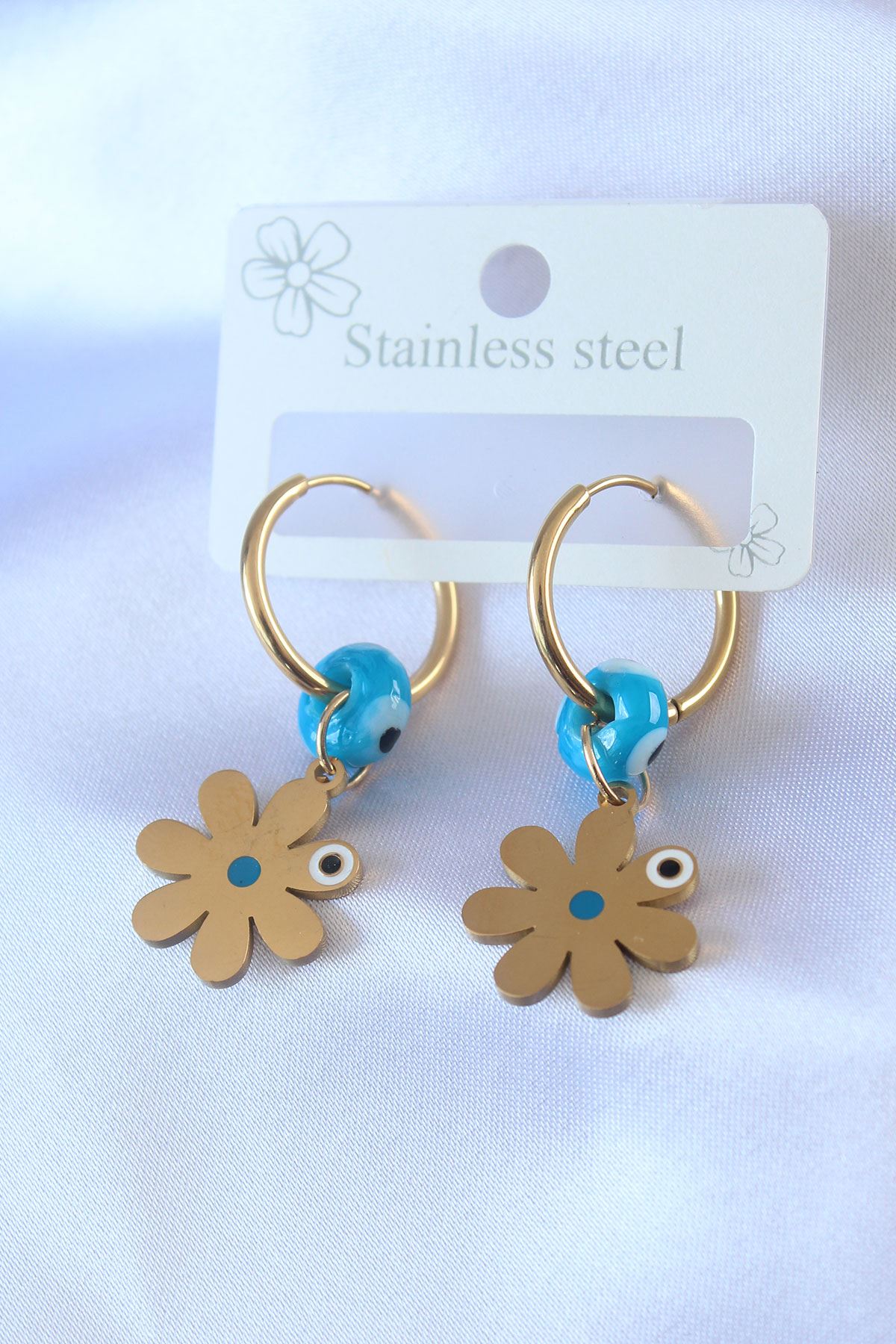 YRTCL 316L Çelik Gold Renk Çiçek Model Nazar Boncuk Detay Kadın Küpe