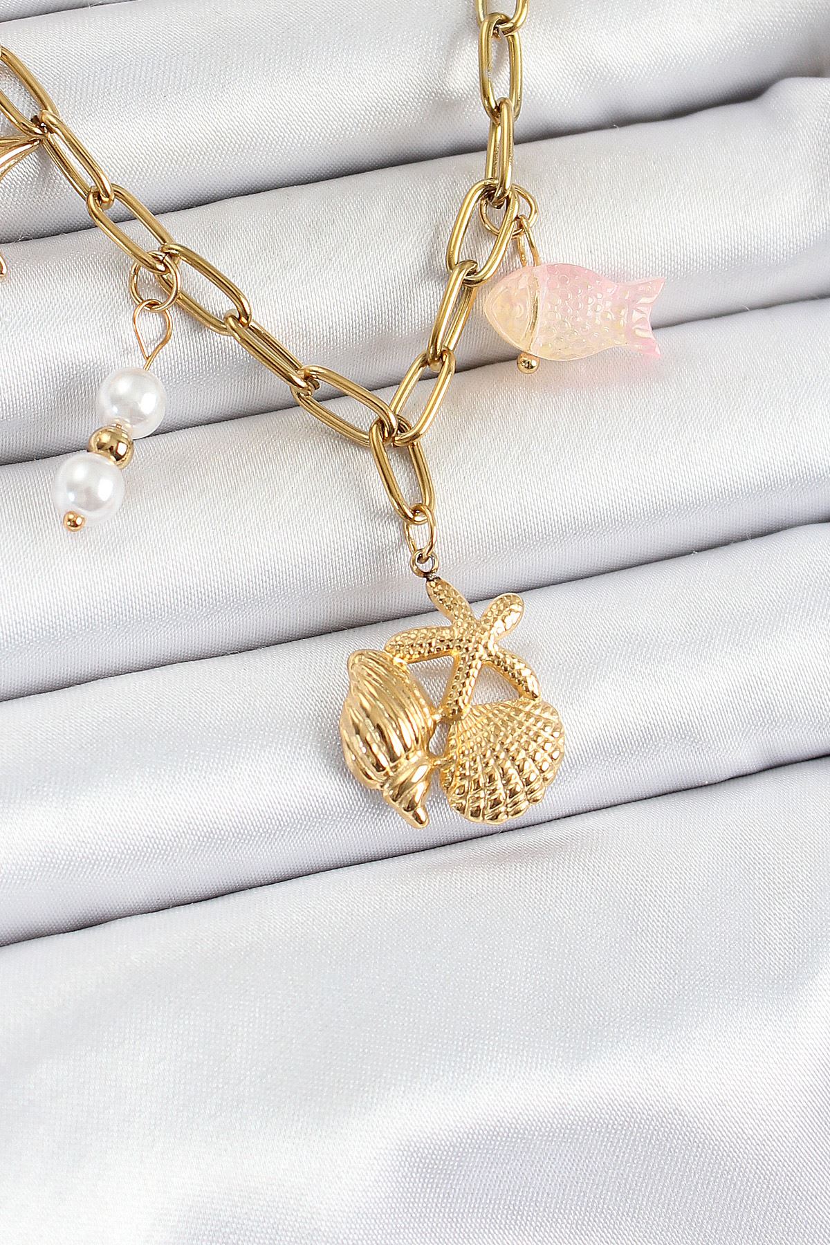 YRTCL 316L Çelik Gold Renk Deniz Yıldızı ve Deniz Kabuğu Konsept Kadın Kolye