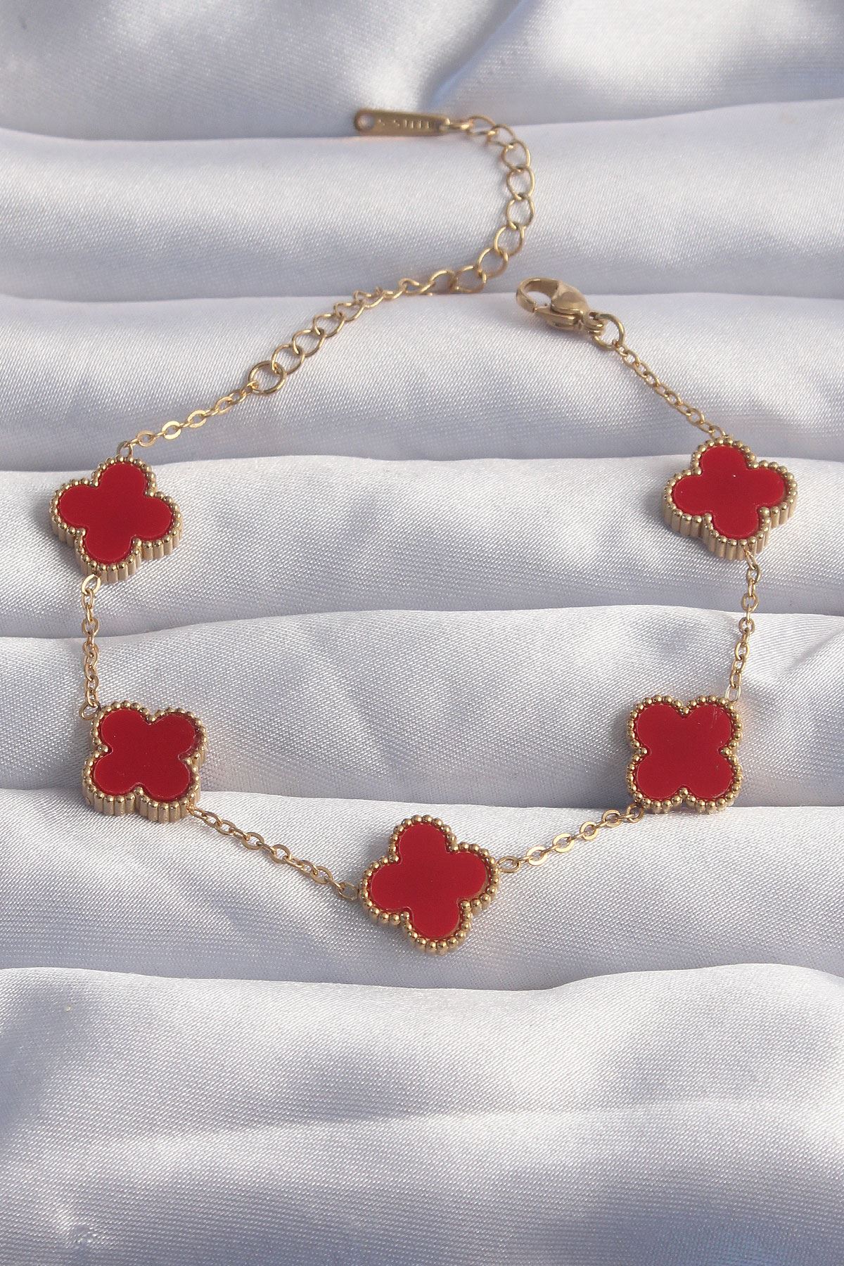 YRTCL 316L Çelik Gold Renk Kırmızı Mineli Yonca Bileklik
