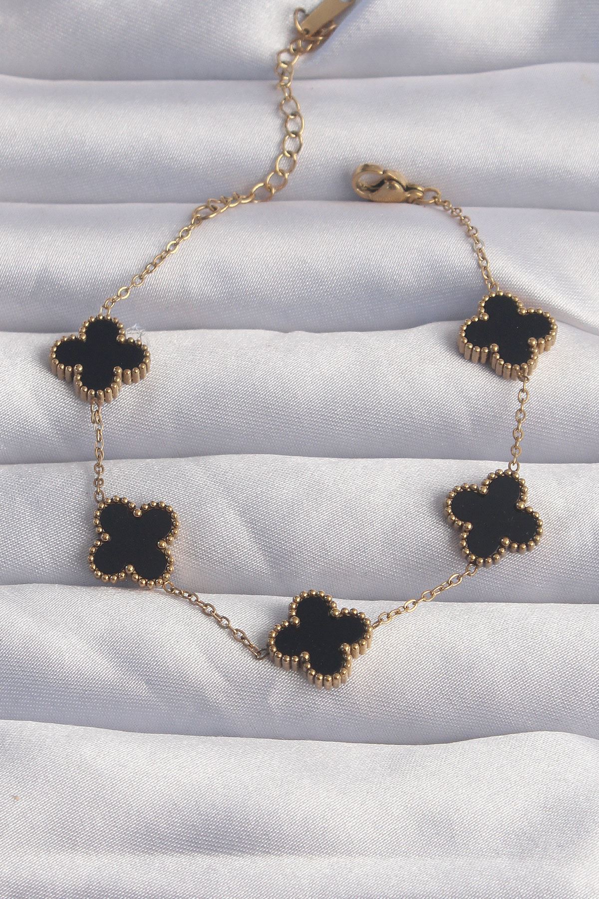 YRTCL 316L Çelik Gold Renk Siyah Mineli Yonca Bileklik