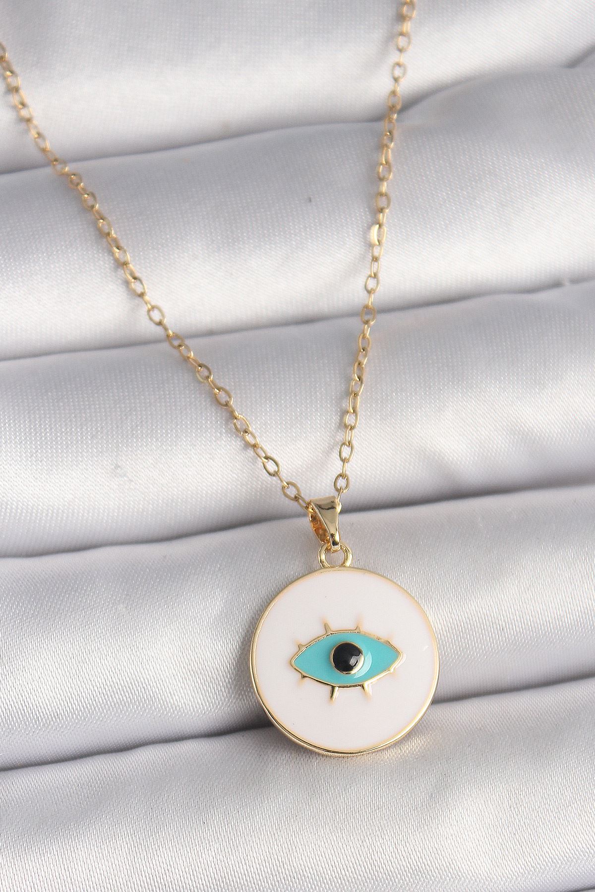 YRTCL 316L Çelik Gold Renk Zincir Beyaz Mineli Turkuaz Göz İşleme Model Kadın Kolye