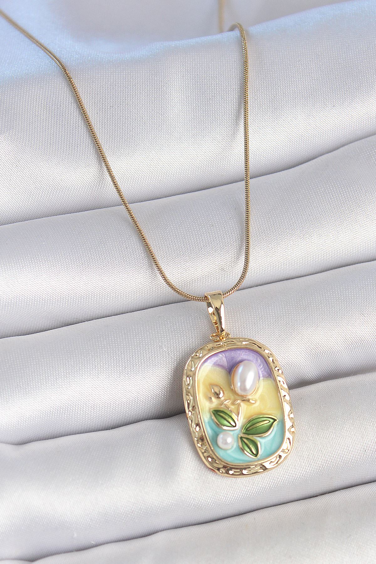 YRTCL 316L Çelik Gold Renk Zincir İncili Çiçek İşlemeli Portre Model Kadın Kolye