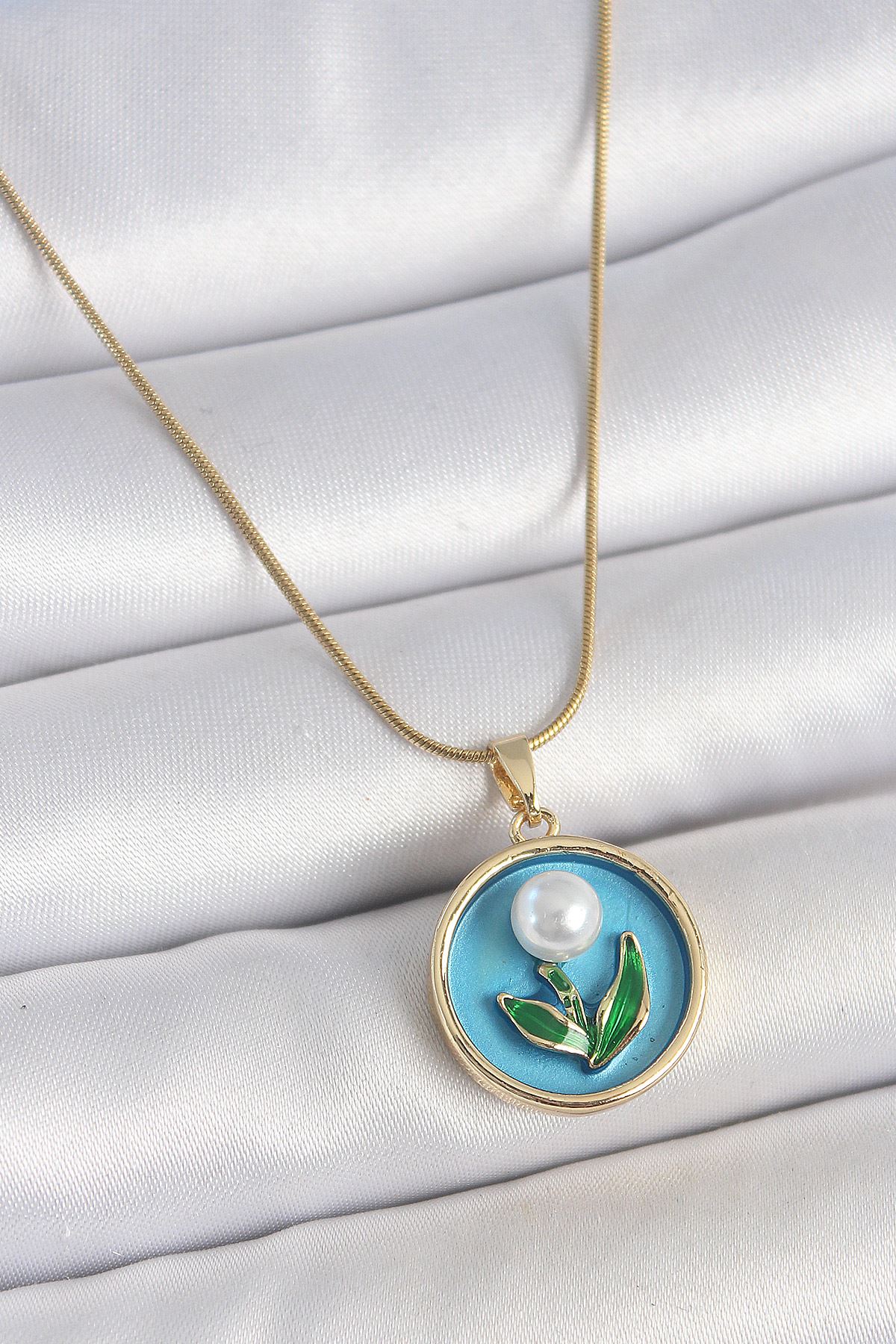 YRTCL 316L Çelik Gold Renk Zincir Mavi Mineli İncili Çiçek İşlemeli Portre Model Kadın Kolye