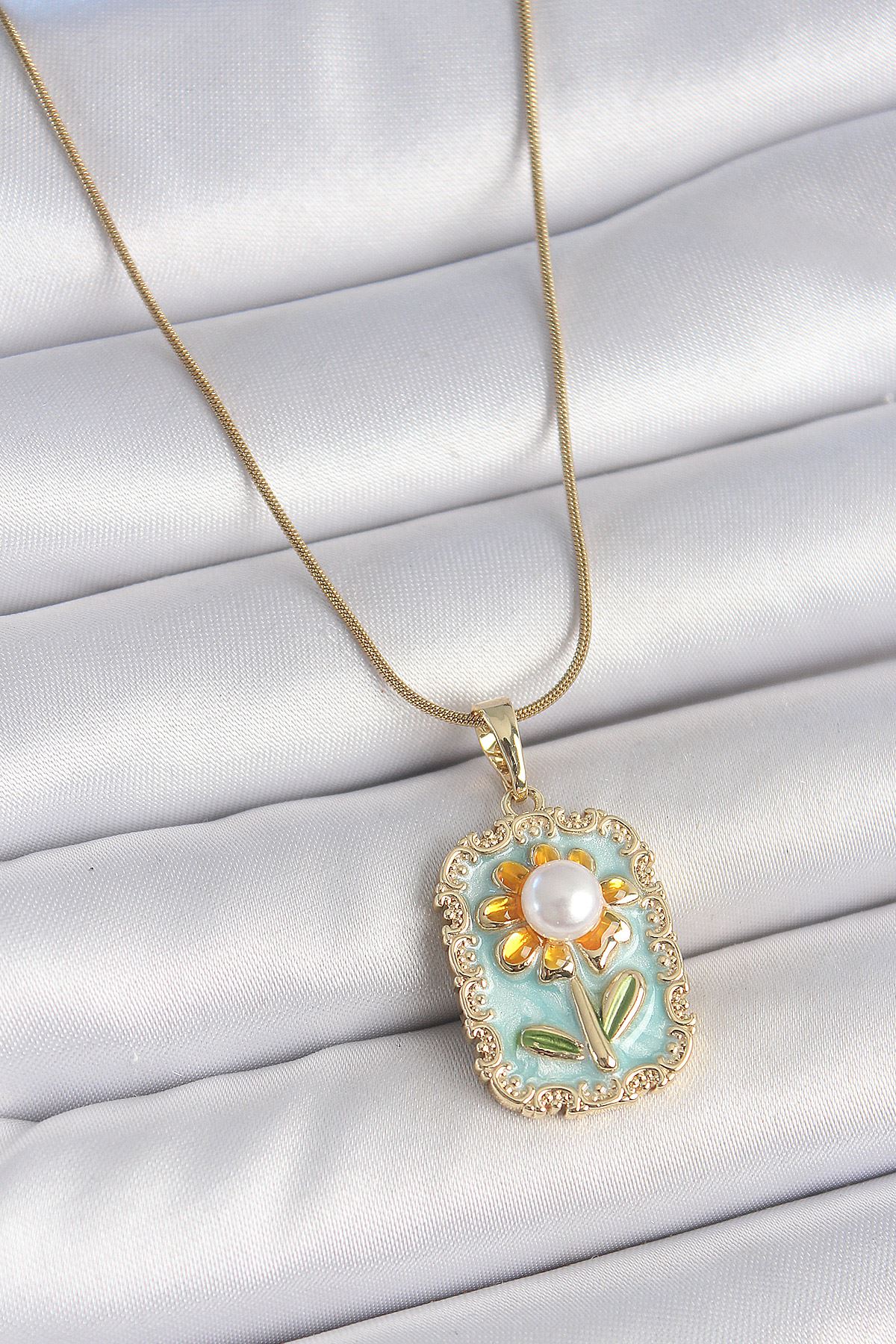 YRTCL 316L Çelik Gold Renk Zincir Mavi Mineli İncili Papatya İşlemeli Portre Model Kadın Kolye