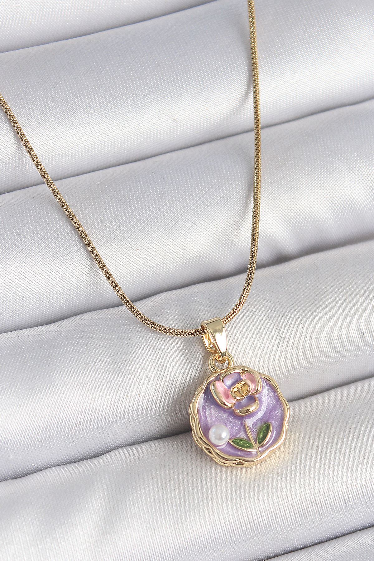 YRTCL 316L Çelik Gold Renk Zincir Mor Minimal Çiçek İşlemeli İnci Detay Portre Model Kadın Kolye
