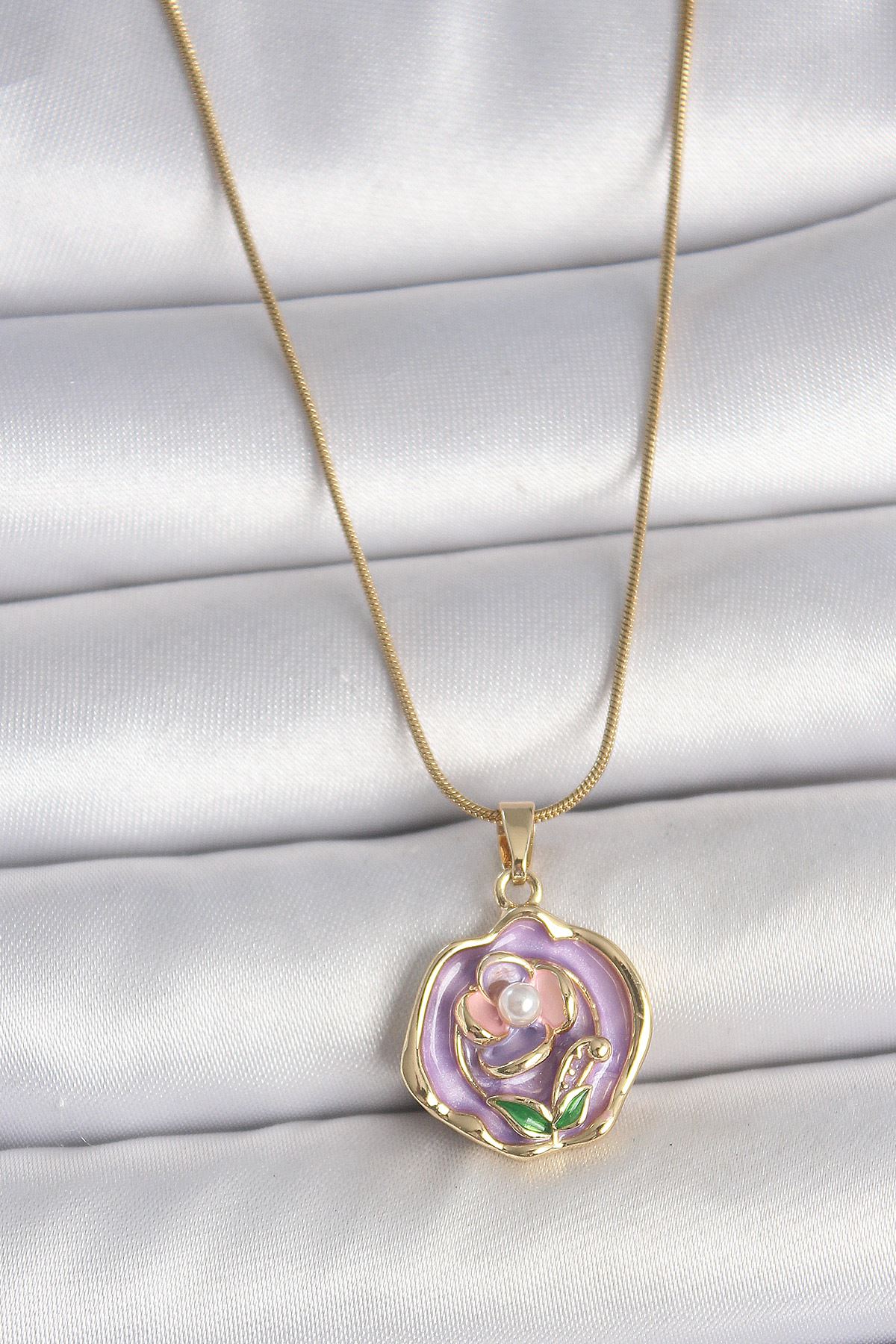YRTCL 316L Çelik Gold Renk Zincir Mor Renkli Çiçek İşlemeli İnci Detay Portre Model Kadın Kolye