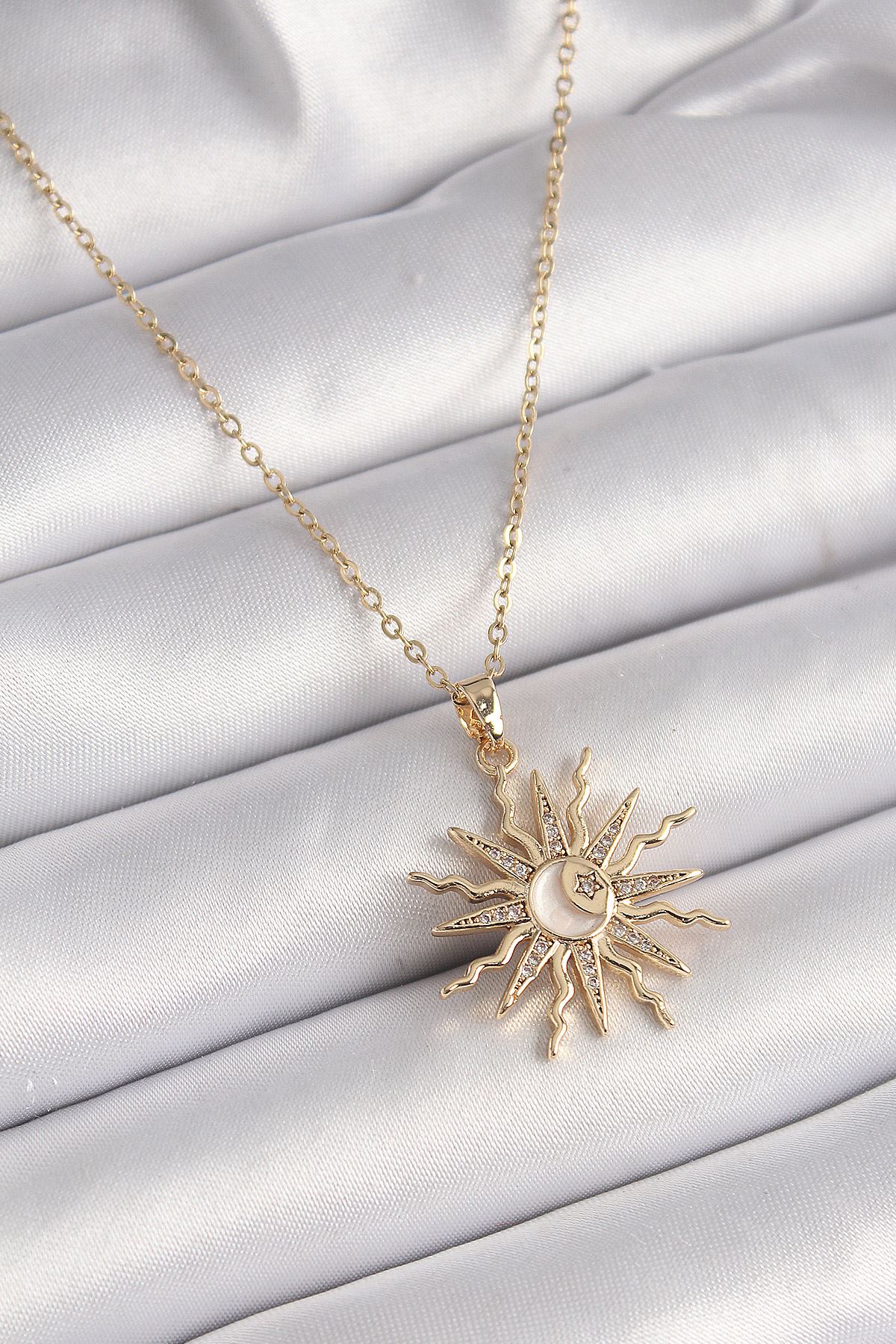 YRTCL 316L Çelik Gold Renk Zincir Renkli Zirkon Taşlı Sedefli Ay İşleme Detay Kadın Kolye