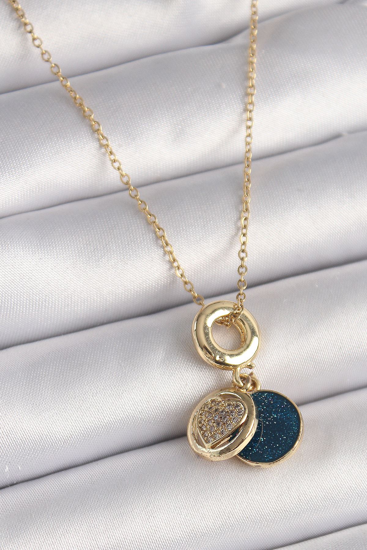 YRTCL 316L Çelik Gold Renk Zincir Zirkon Taşlı Kalp Model Mavi Simli Kadın Kolye