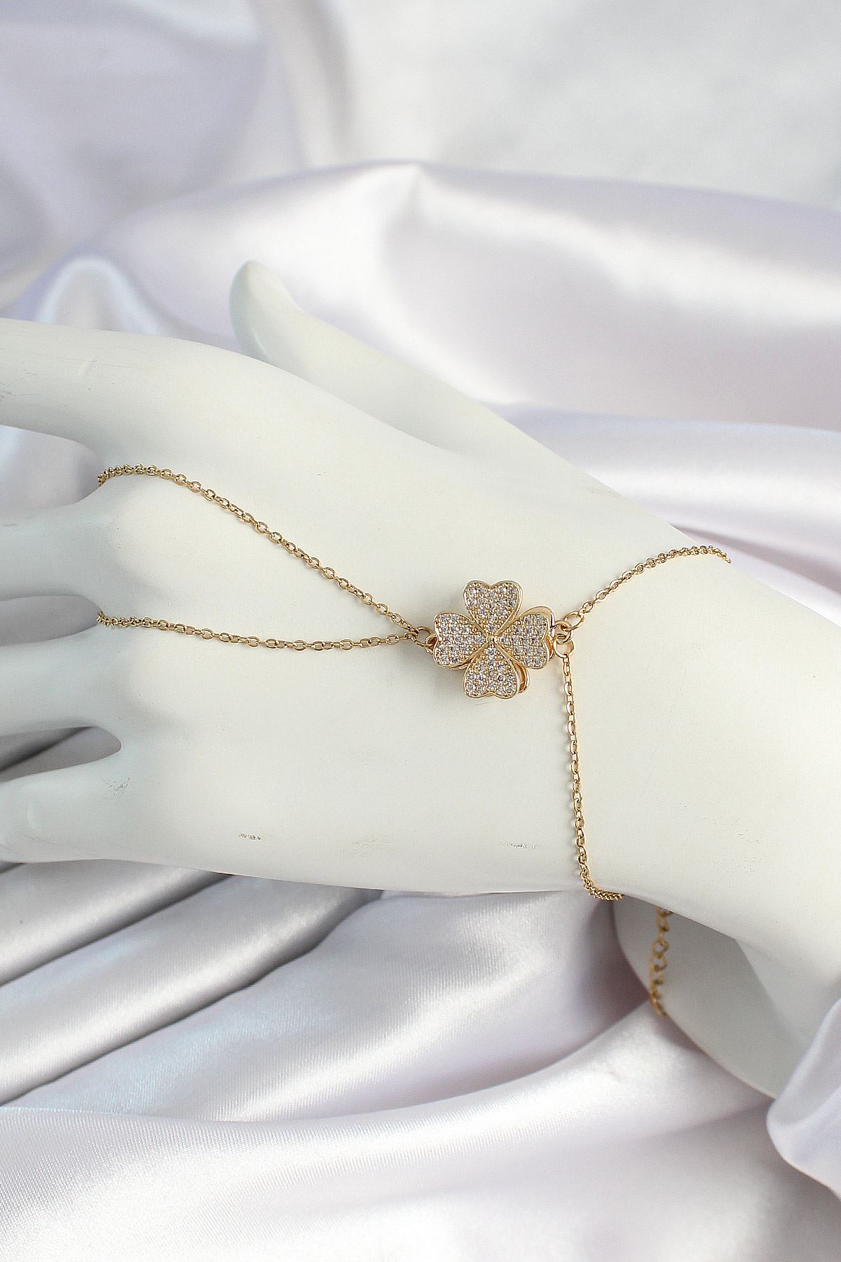 YRTCL Pirinç Zirkon Taşlı Yonca Model Gold Renk Kadın Bileklik