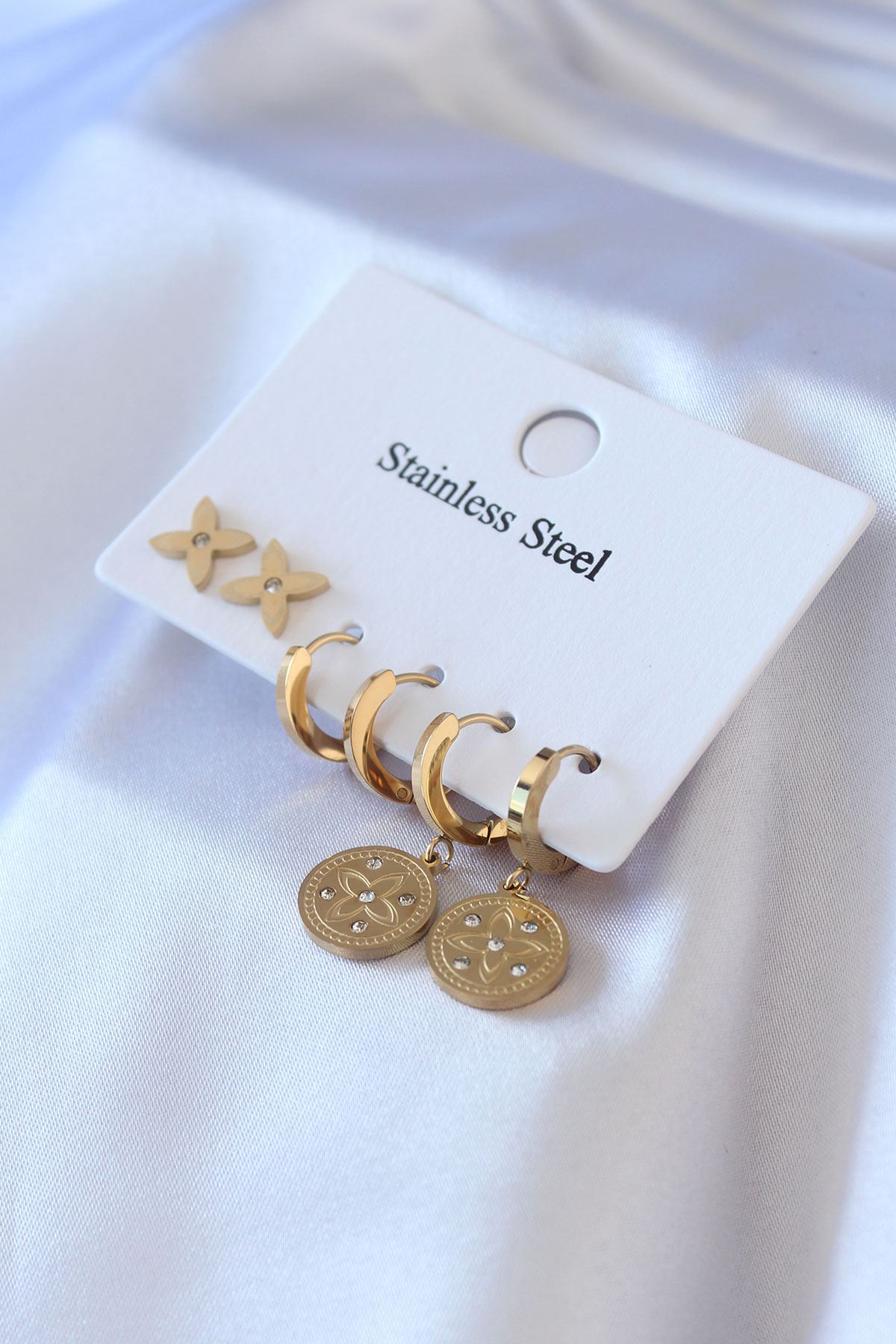 YRTCL 316L Çelik Gold Renk Zirkon Taş Detay Çiçek İşleme Kadın Küpe Seti