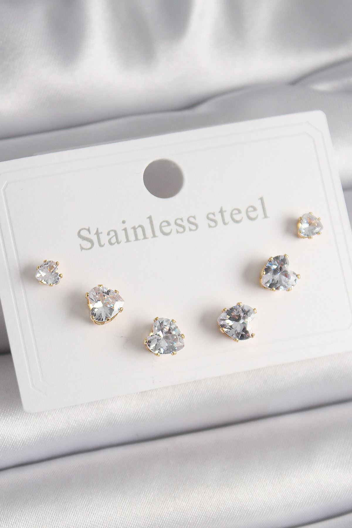 YRTCL Pirinç Zirkon Taşlı Kalp Model Gold Renk 3'lü Çift Kadın Küpe Set
