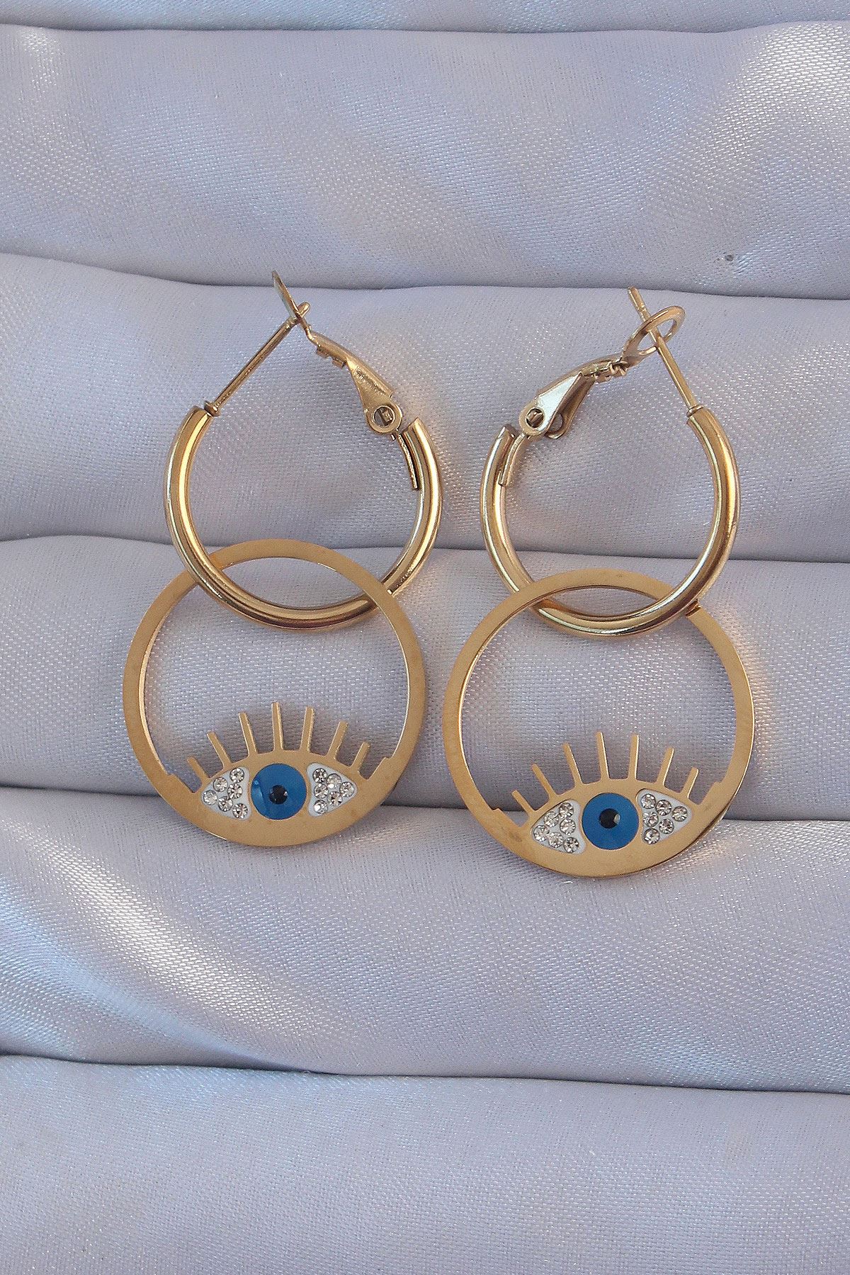 YRTCL 316L Çelik Gold Renk Zirkon Taşlı Mavi Göz Tasarımlı Halka Küpe