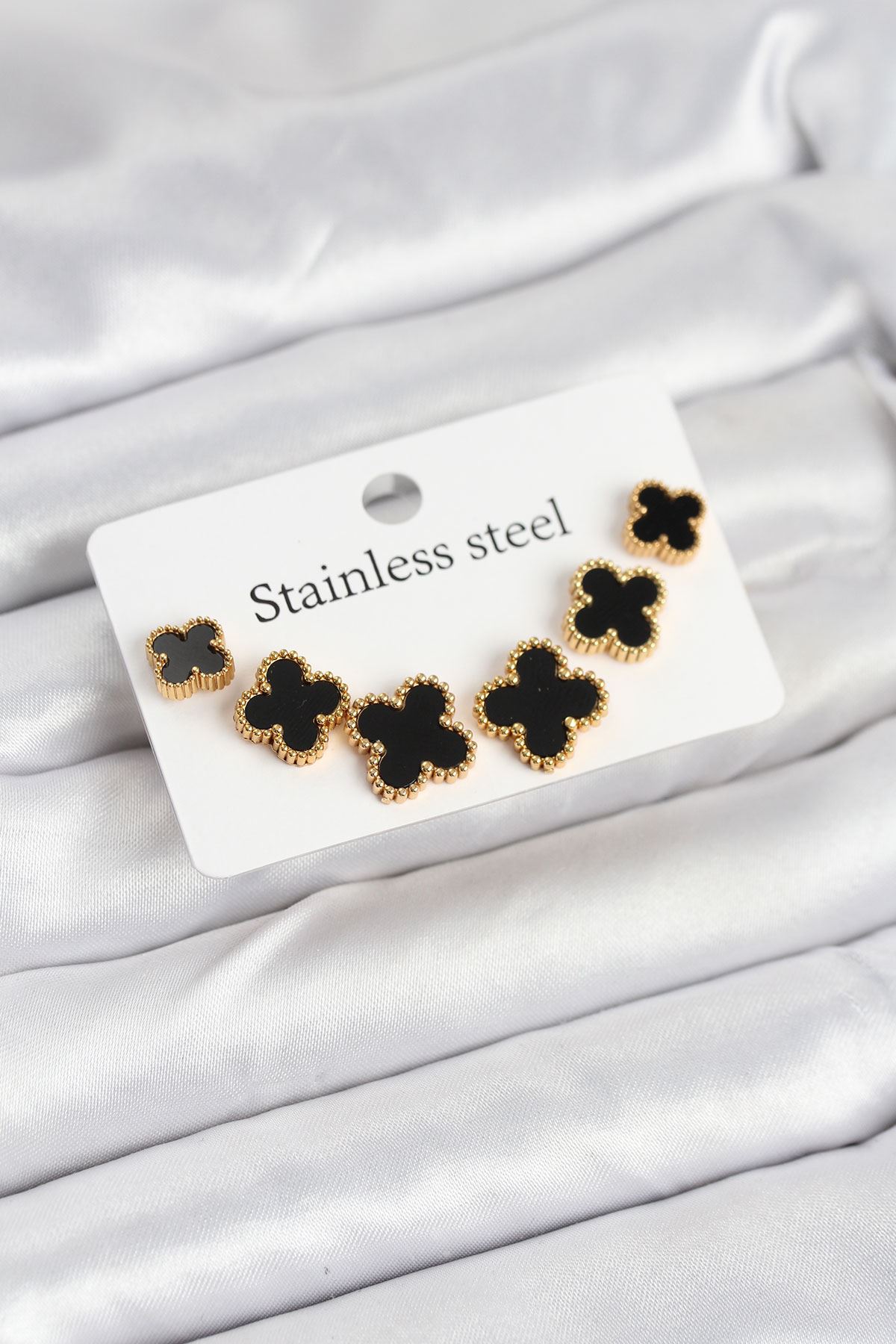 YRTCL 316L Çelik Gold Siyah Renk 3 Boy Yonca Küpe Seti