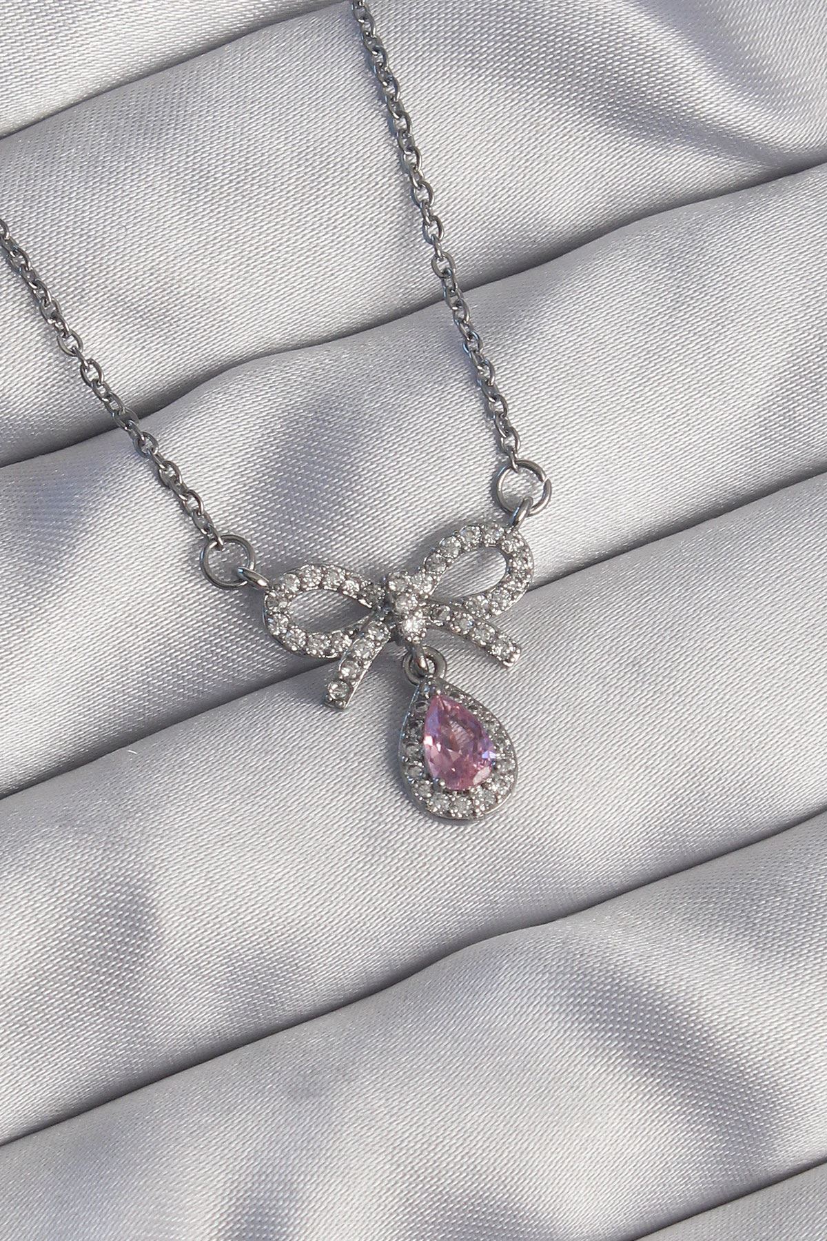YRTCL 316L Çelik Gümüş Renk Fiyonk Detay Pembe Zirkon Taşlı Damla Kolye