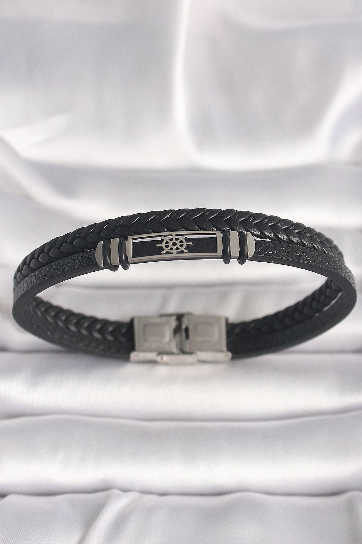 YRTCL 316L Çelik Gümüş Renk Gemi Dümeni Figür Siyah Burgu Deri Kordon Model Erkek Bileklik