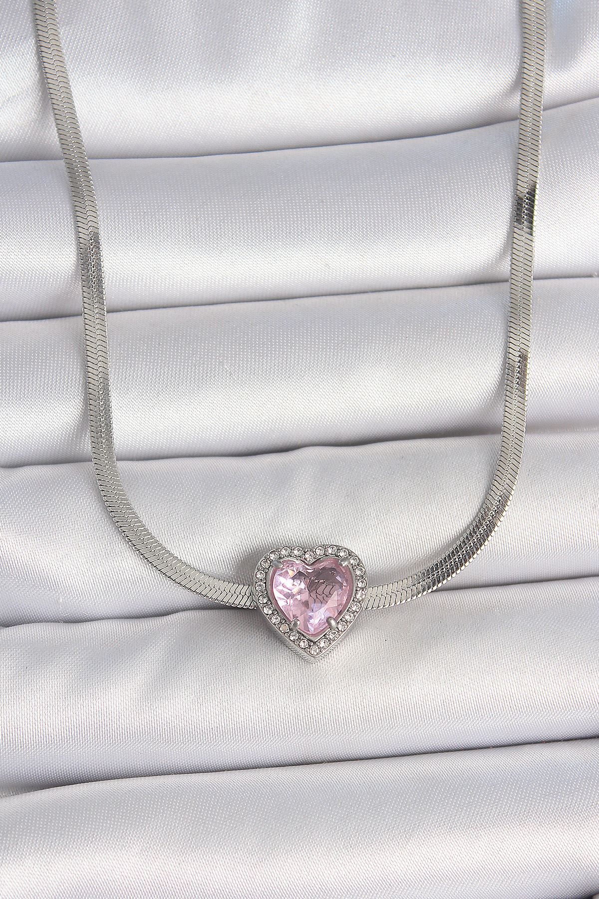 YRTCL 316L Çelik Gümüş Renk İtalyan Zincir Pembe Zirkon Taşlı Kalp Model Kadın Kolye
