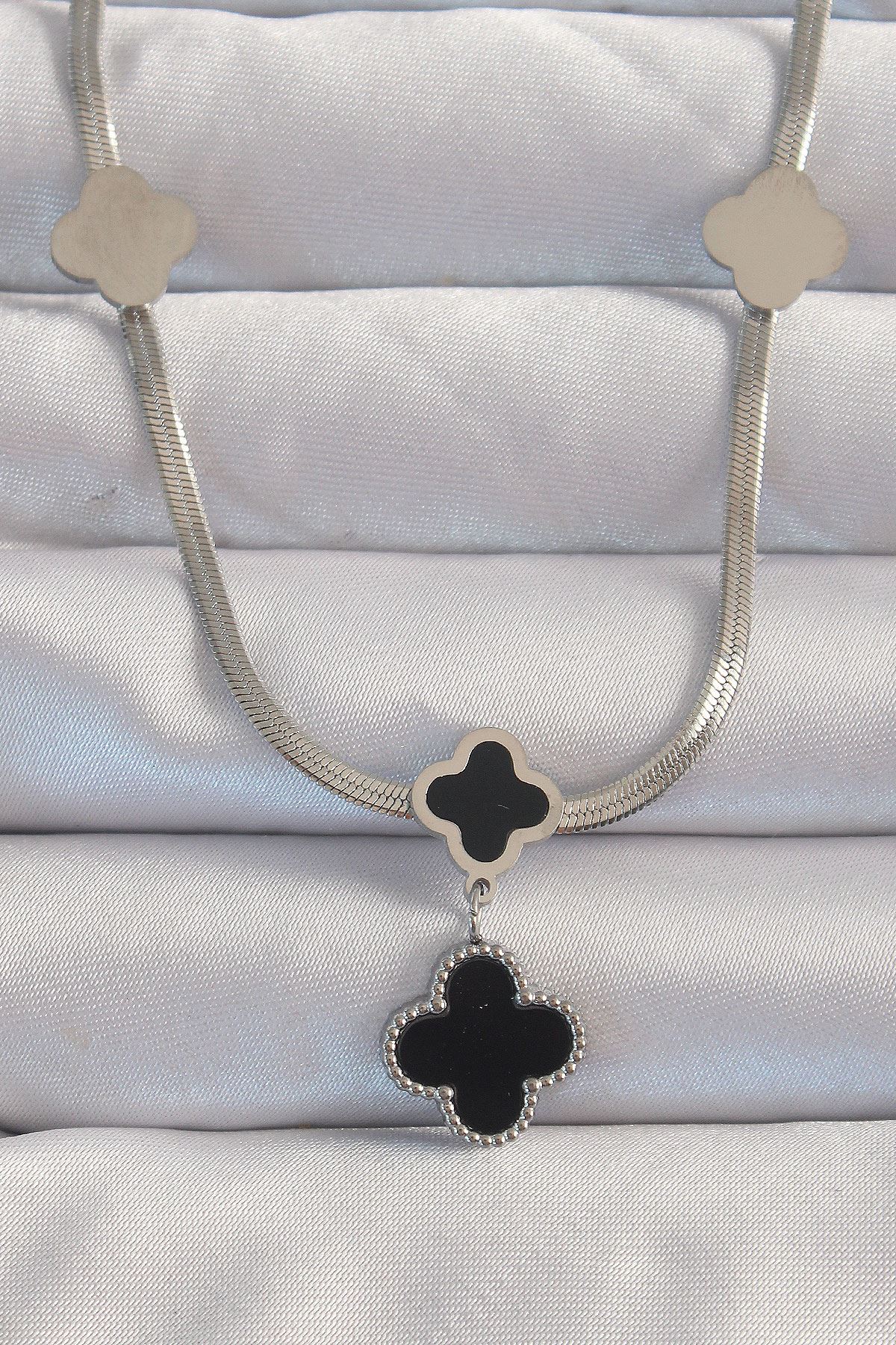 YRTCL 316L Çelik Gümüş Renk İtalyan Zincirli Mineli Yonca Kolye