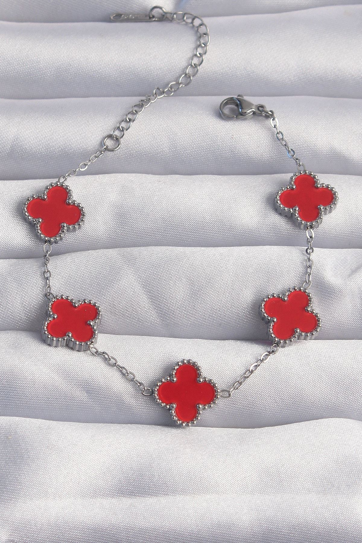 YRTCL 316L Çelik Gümüş Renk Kırmızı Mineli Yonca Bileklik