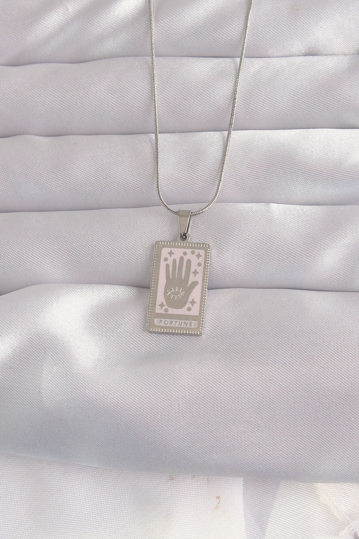 YRTCL 316L Çelik Gümüş Renk Pembe Mineli El Figür Tarot Kolye