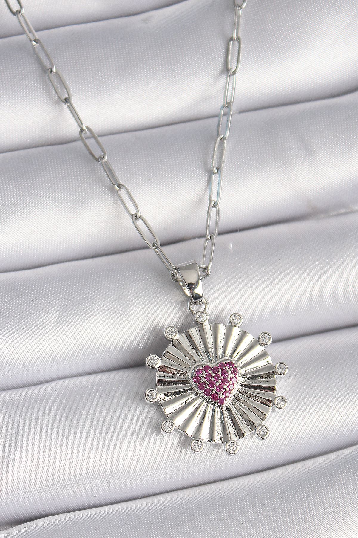 YRTCL 316L Çelik Gümüş Renk Pembe Zirkon Taşlı Kalp İşleme Madalyon Model Kadın Kolye