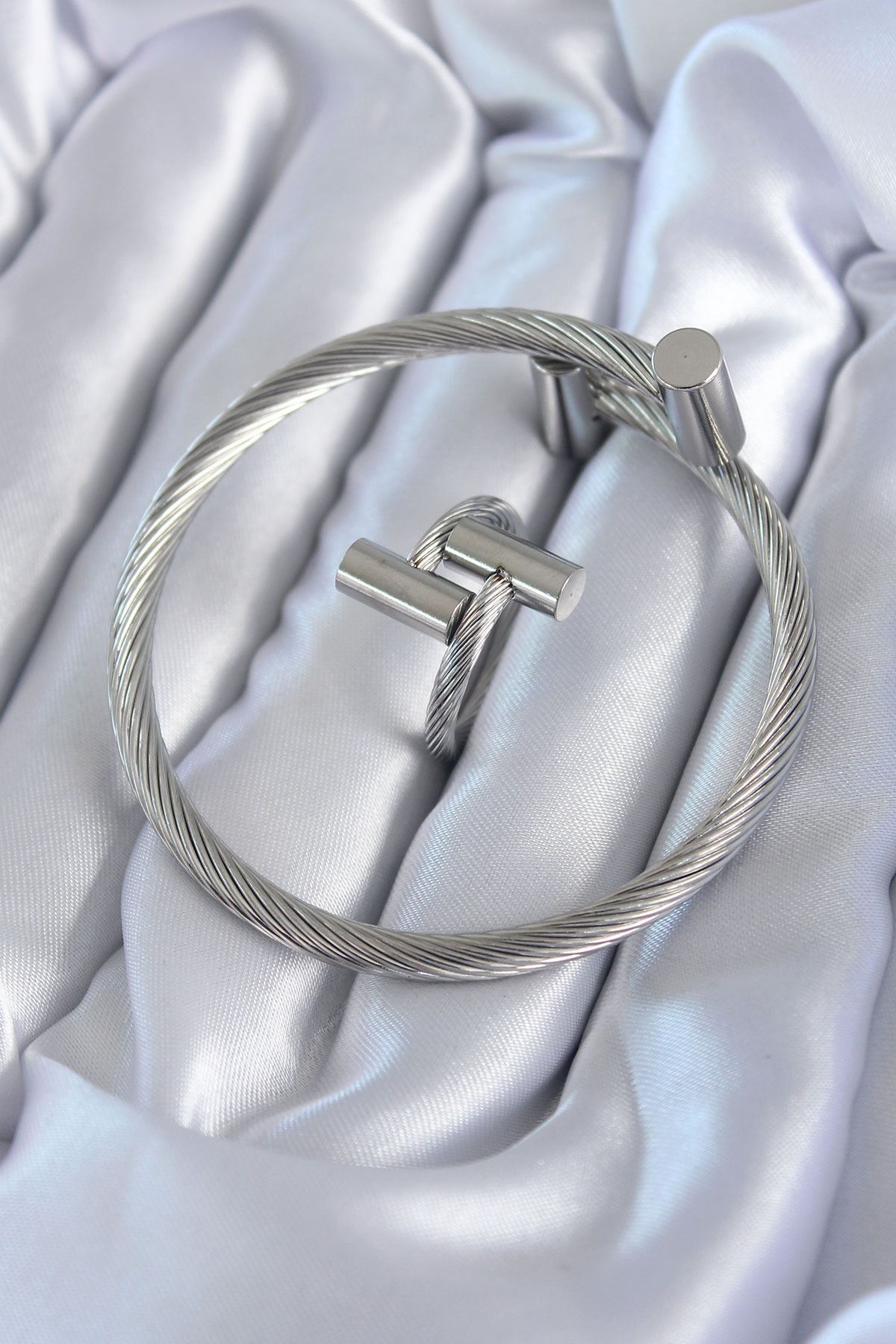 YRTCL 316L Çelik Gümüş Renk Oval Aksesuarlı Burgu Model Bileklik ve Yüzük Kombini