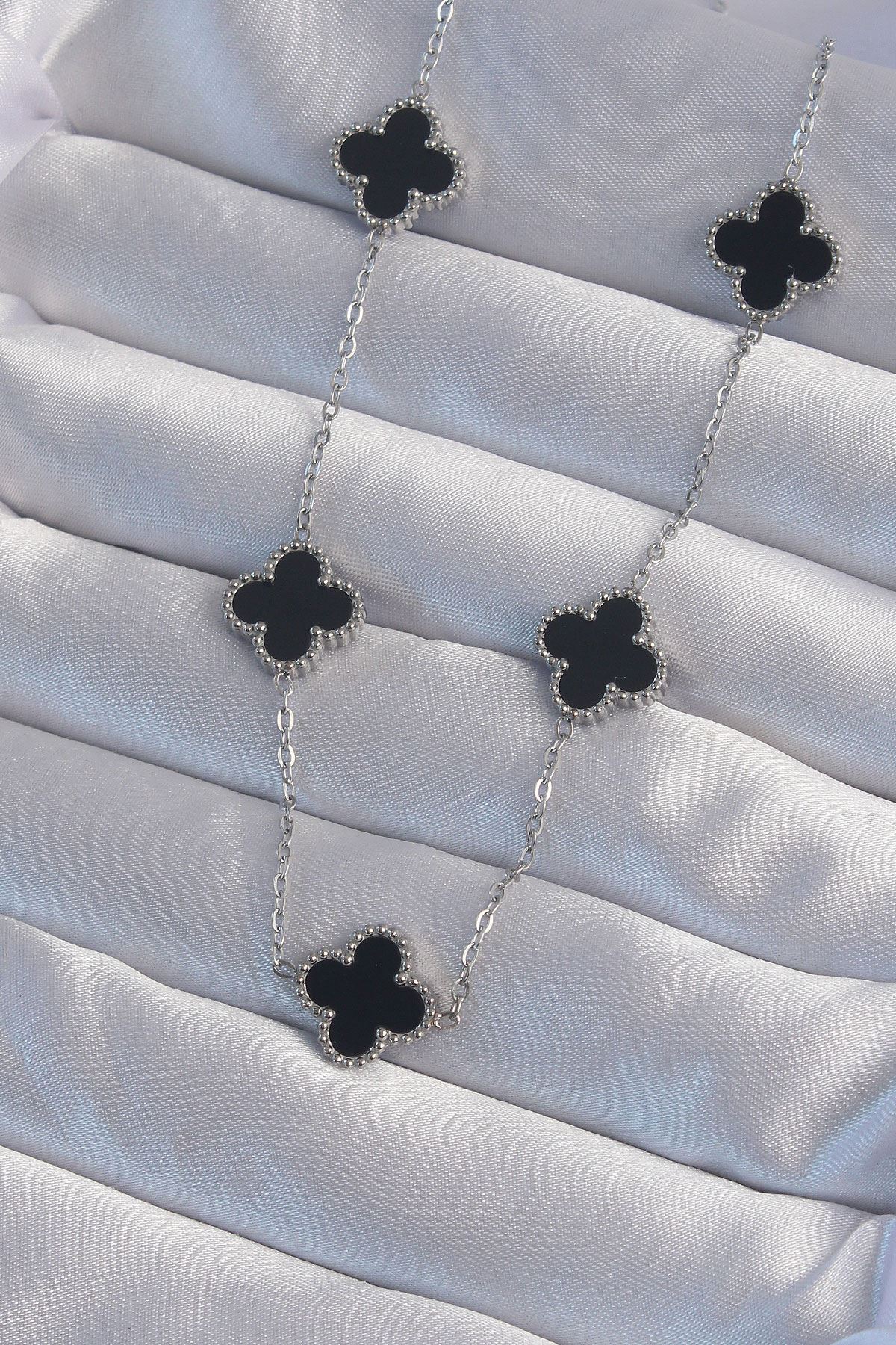 YRTCL 316L Çelik Gümüş Renk Siyah Mineli Yonca Kolye
