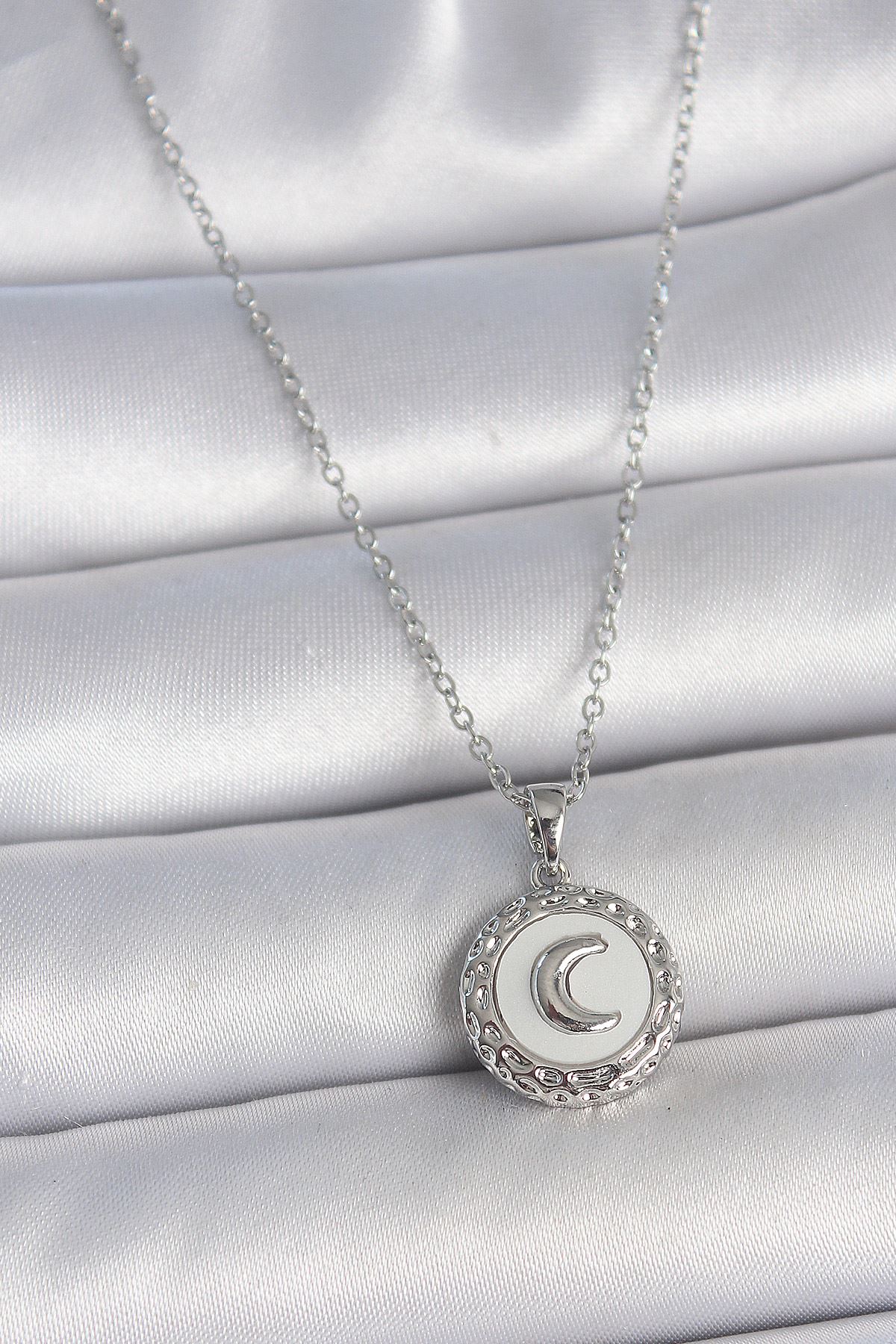 YRTCL 316L Çelik Gümüş Renk Zincir Beyaz Mineli Hilal İşlemeli Madalyon Model Kadın Kolye