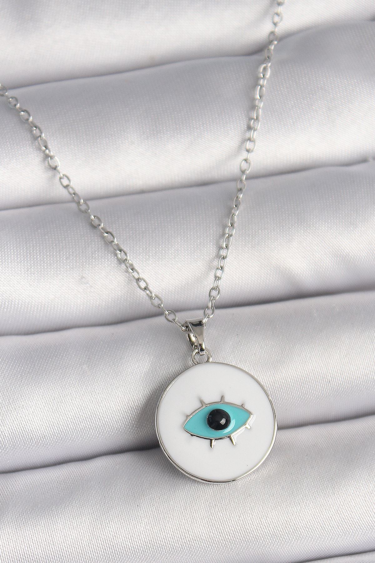 YRTCL 316L Çelik Gümüş Renk Zincir Beyaz Mineli Turkuaz Göz İşleme Model Kadın Kolye