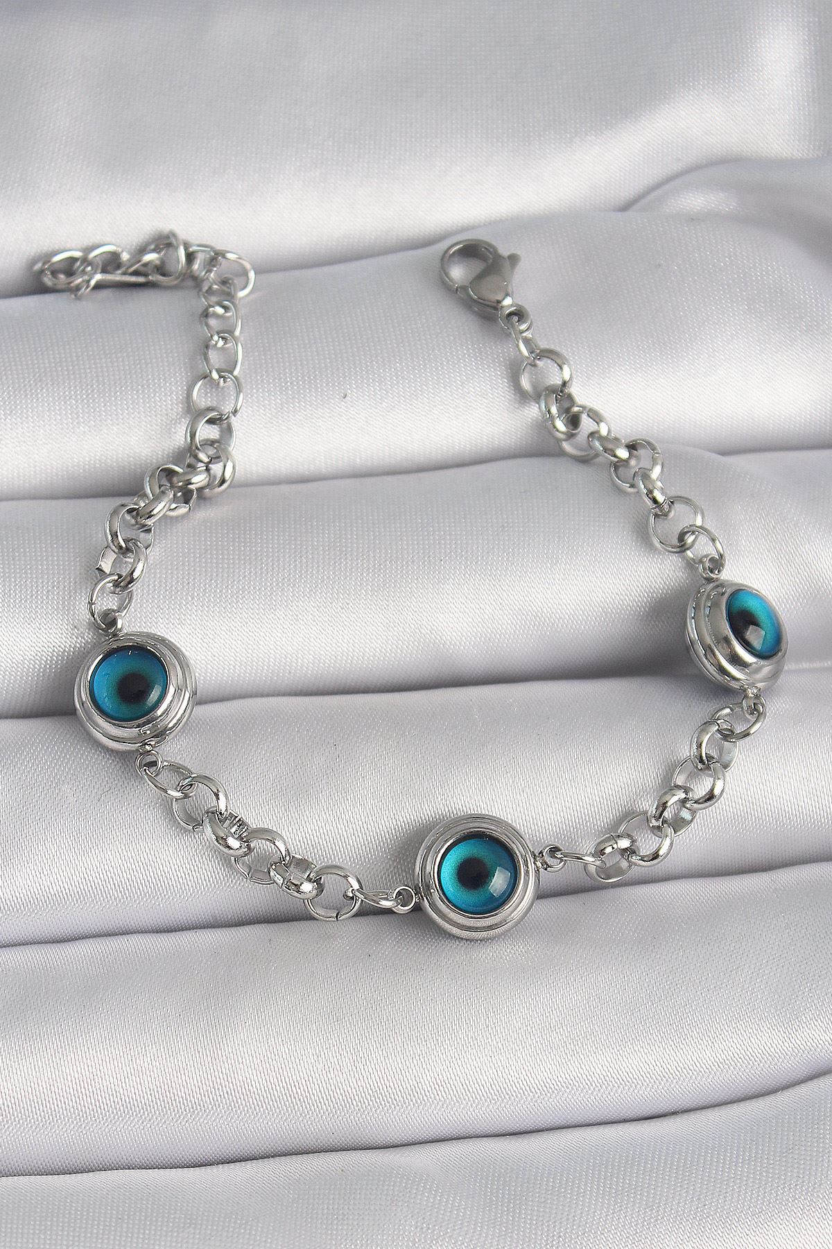 YRTCL 316L Çelik Gümüş Renk Zincir Model Nazar Boncuklu Kadın Bileklik