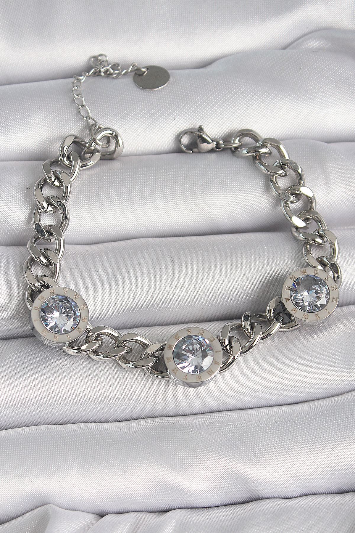 YRTCL 316L Çelik Gümüş Renk Zincir Model Zirkon Taşlı İşleme Detaylı Kadın Bileklik