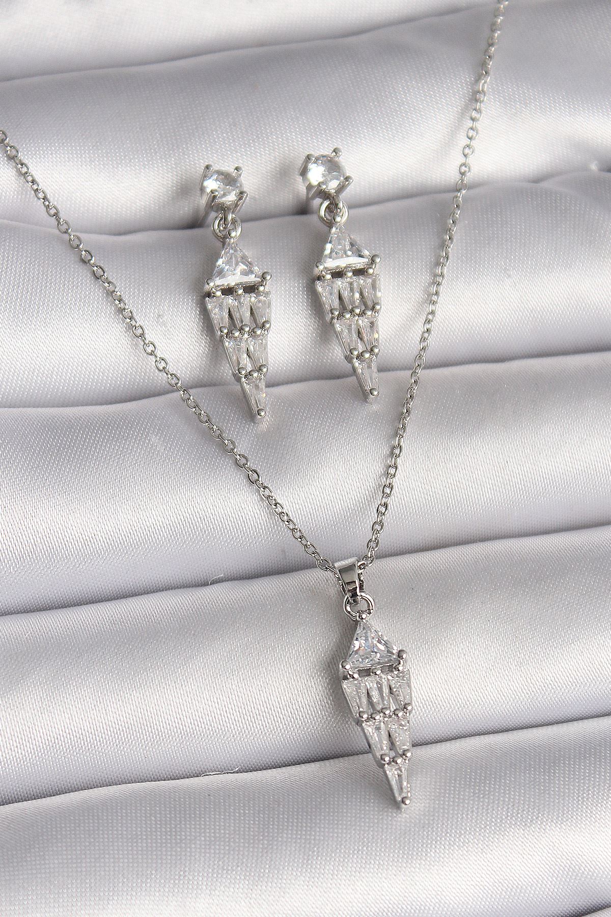 YRTCL 316L Çelik Gümüş Renk Zincir Sallantı Zirkon Taş Model Kadın Kolye Küpe Seti