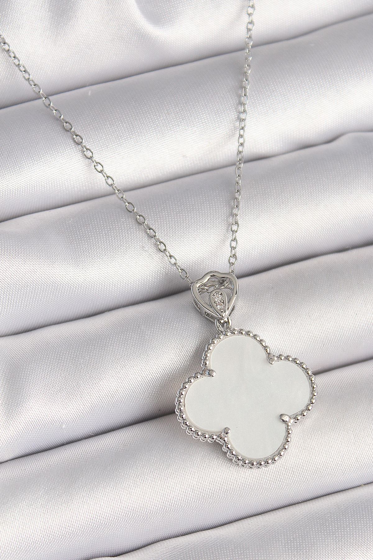 YRTCL 316L Çelik Gümüş Renk Zincir Zirkon Taş Detaylı Beyaz Yonca Model Kadın Kolye