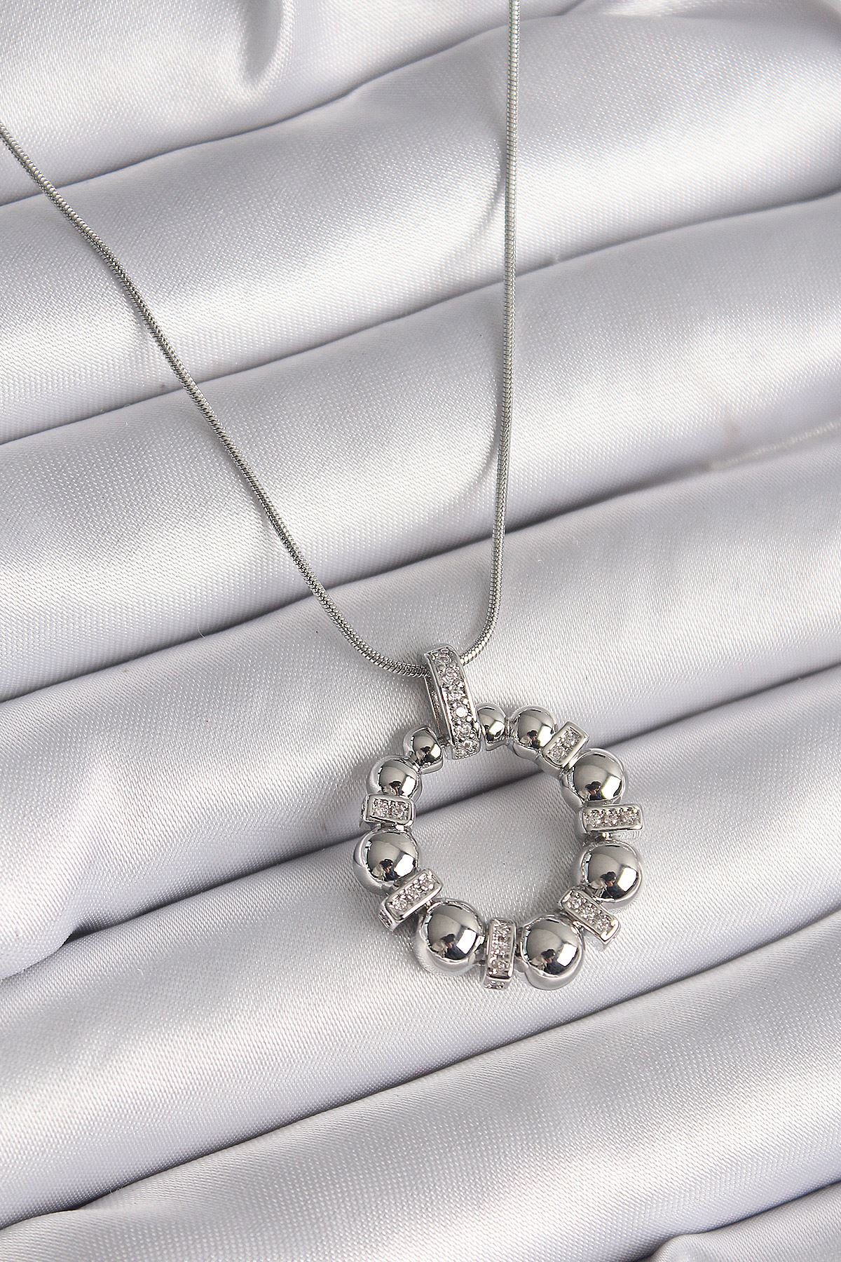 YRTCL 316L Çelik Gümüş Renk Zincir Zirkon Taş Detaylı Bombeli Halka Model Kadın Kolye
