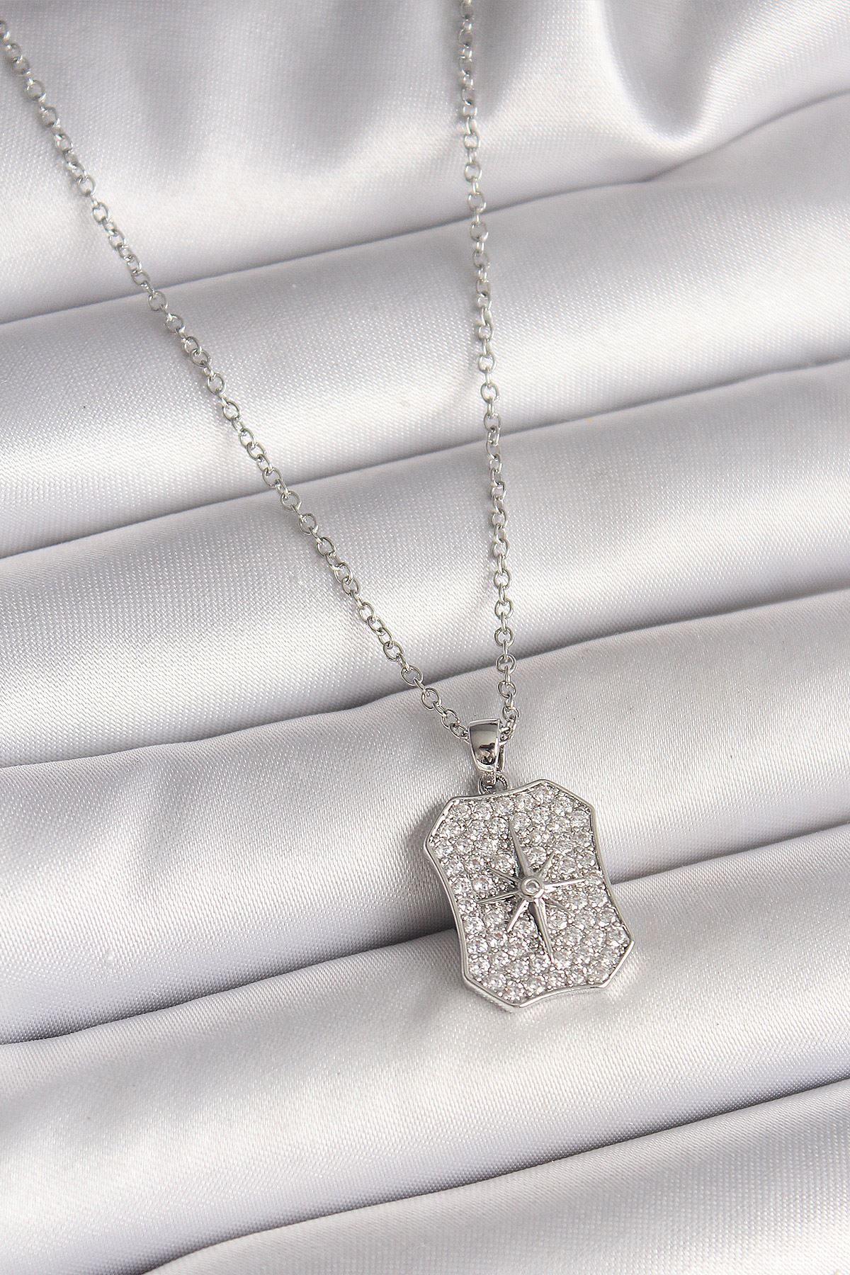 YRTCL 316L Çelik Gümüş Renk Zincir Zirkon Taşlı Kutup Yıldız İşlemeli Madalyon Model Kadın Kolye