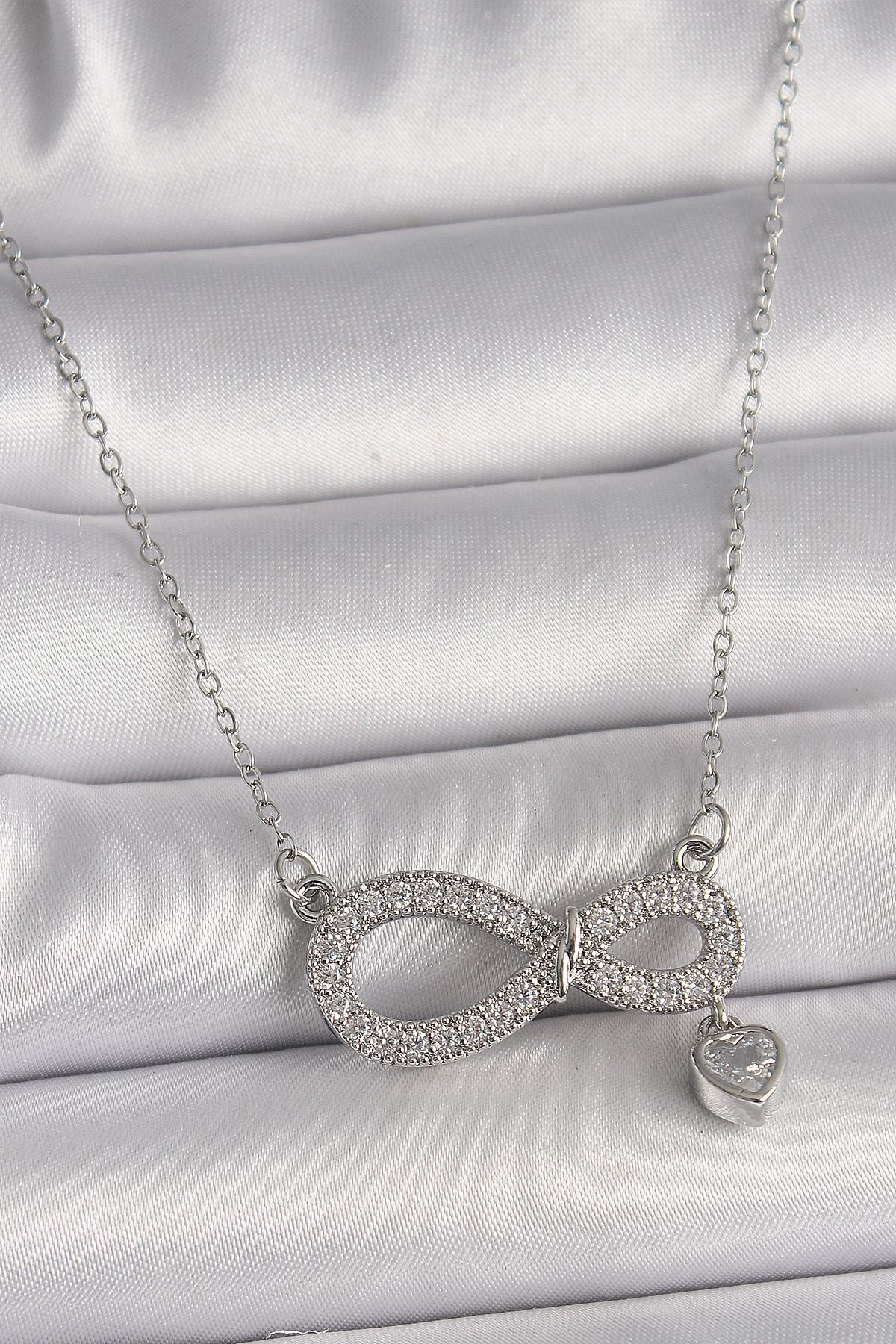 YRTCL 316L Çelik Gümüş Renk Zincir Zirkon Taşlı Sonsuzluk Model Taşlı Kalp Detay Kadın Kolye