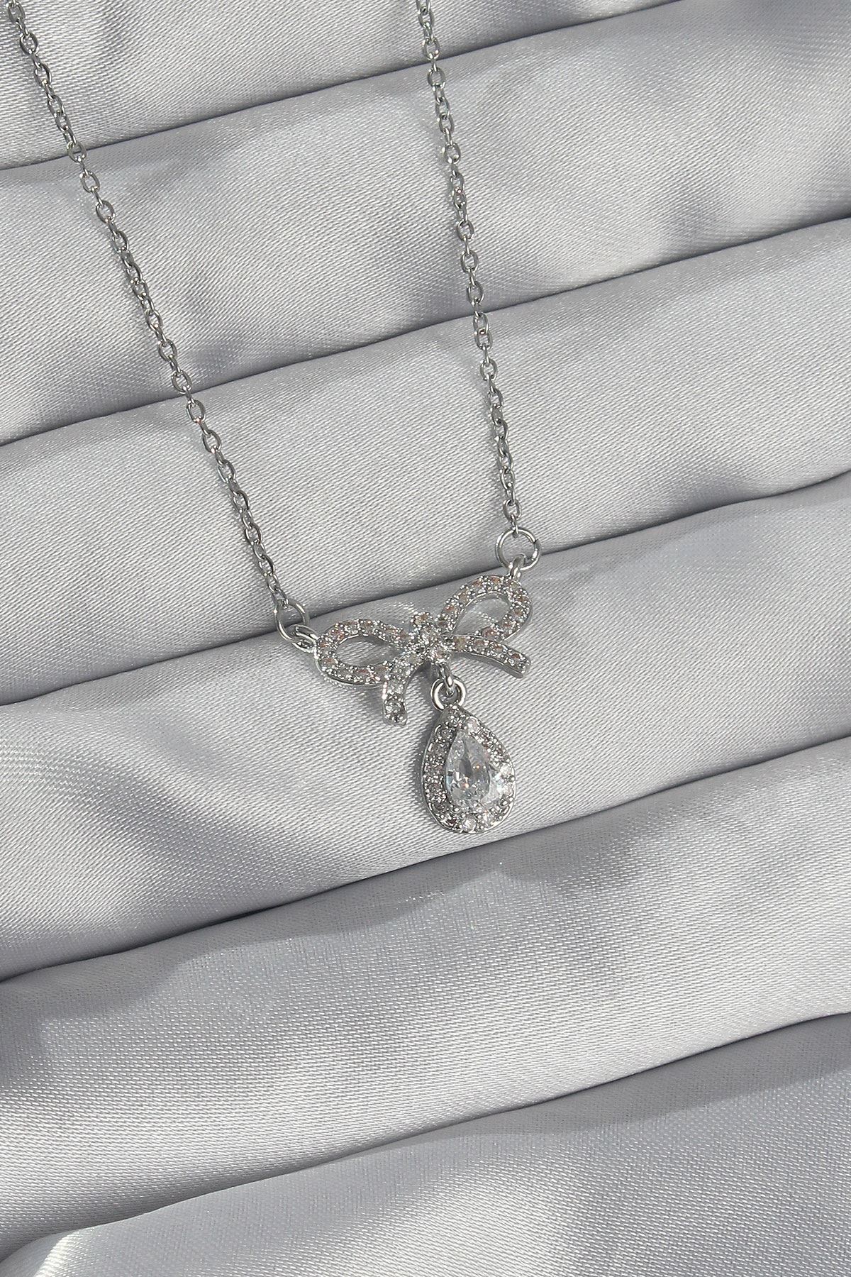 YRTCL 316L Çelik Gümüş Renk Zirkon Taşlı Fiyonk Detay Damla Kolye