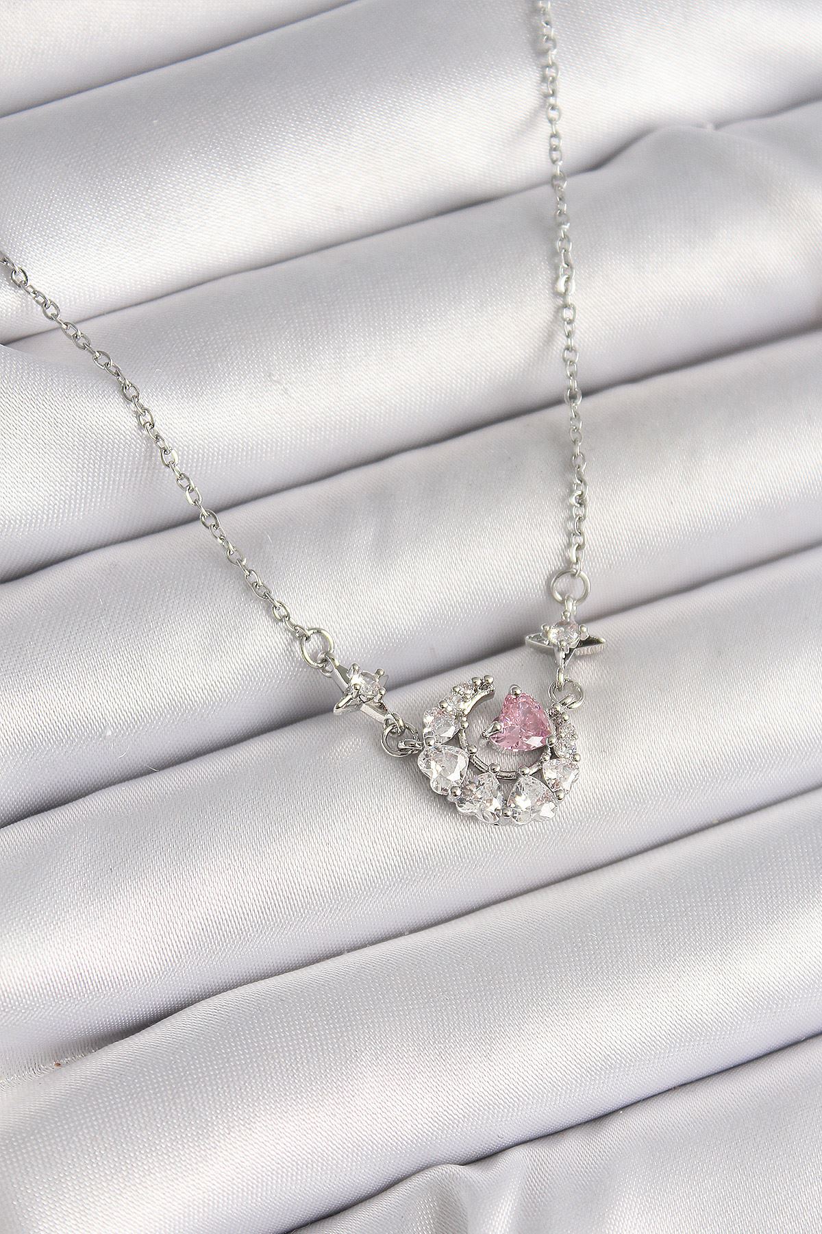 YRTCL 316L Çelik Gümüş Renk Zirkon Taşlı Hilal Pembe Kalp Model Kadın Kolye