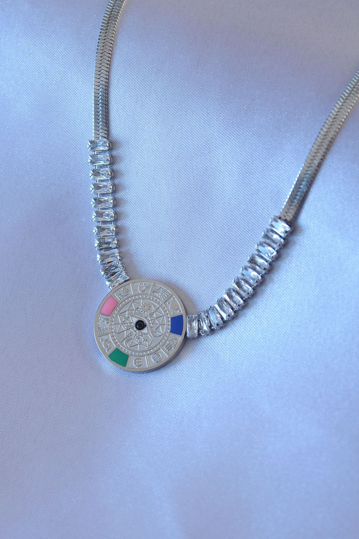 YRTCL 316L Çelik Gümüş Renk Zirkon Taşlı İtalyan Zincir Burç İşeleme Madalyon Model Kadın Kolye