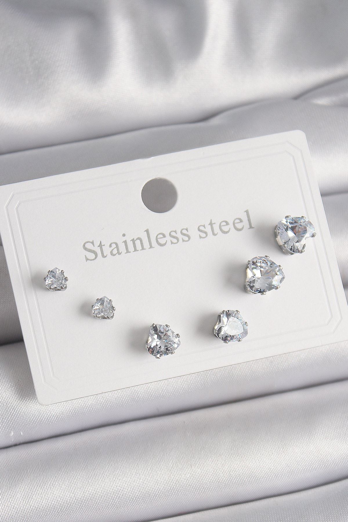 YRTCL Pirinç Gümüş Renk Zirkon Taşlı Sallantılı Kalp Model 3 Çift Kadın Küpe Seti