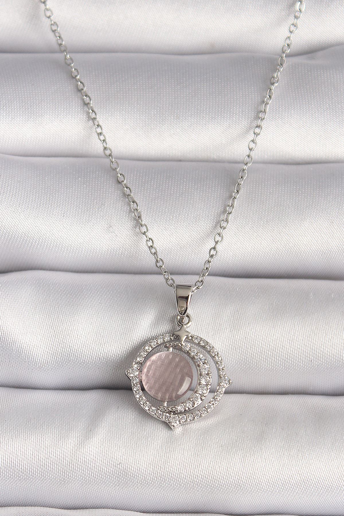 YRTCL 316L Çelik Gümüş Renk Zirkon Taşlı Pembe Sedefli Hilal Model Kadın Kolye