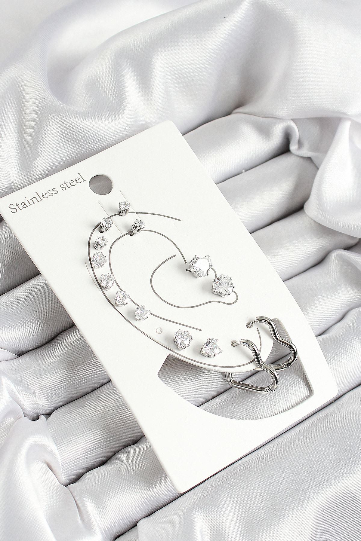 YRTCL 316L Çelik Kalp Figürlü Ve Zirkon Taşlı Gümüş Renk 7'li Çift Kadın Küpe Set