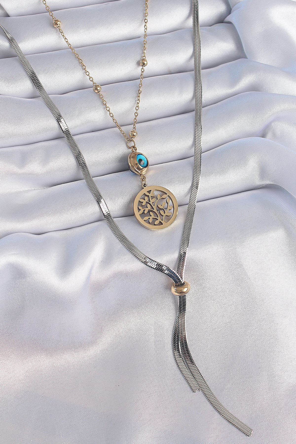YRTCL 316L Çelik Mix Renk Filiz Figür Nazar Boncuk Detay Uzun Kadın Kolye