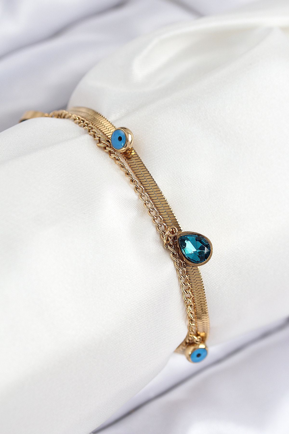YRTCL 316L Çelik Nazar Boncuk Detaylı Mavi Zirkon Taşlı Model İtalyan Zincir Gold Renk Kadın Bileklik