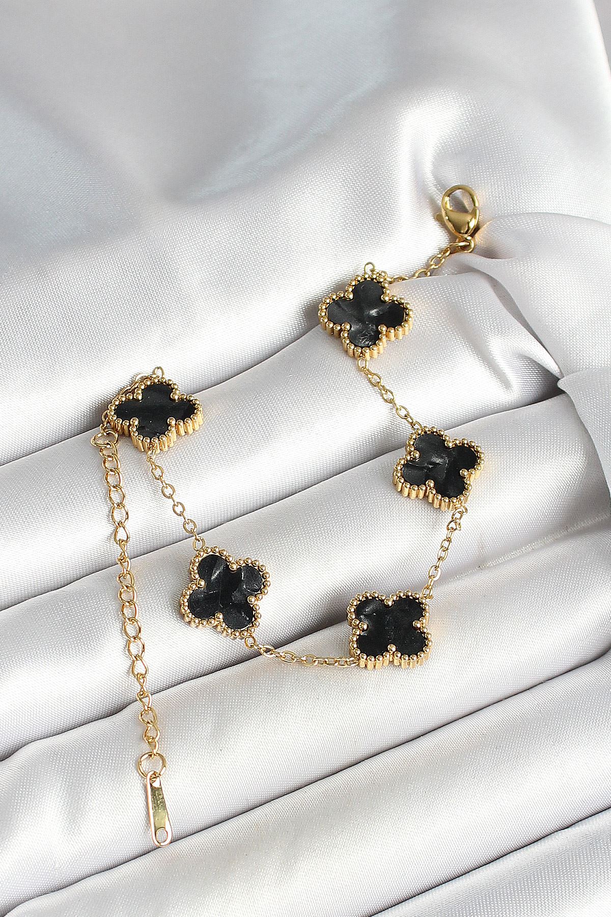 YRTCL 316L Çelik Sedefli Siyah Gold Renk Yonca Kadın Bileklik
