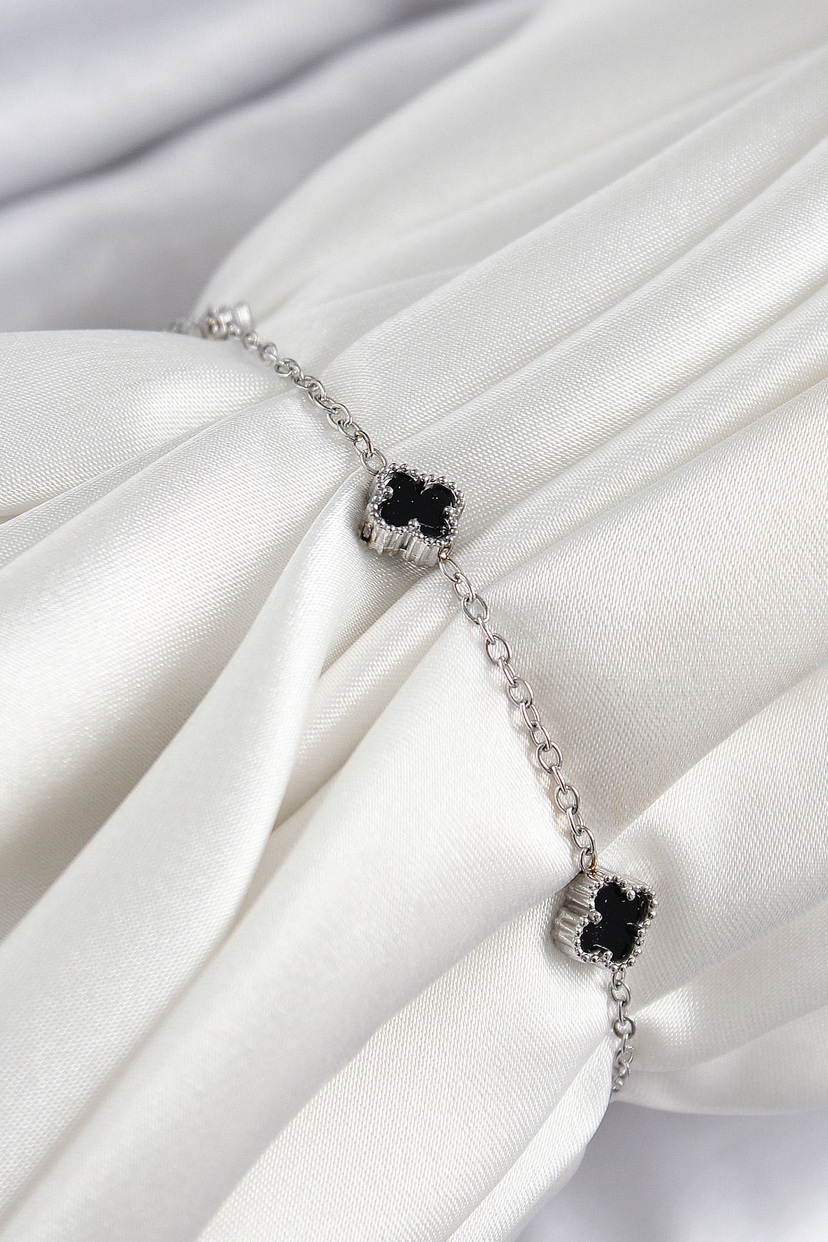YRTCL 316L Çelik Siyah Sedef Yonca Model Gümüş Renk Kadın Bileklik