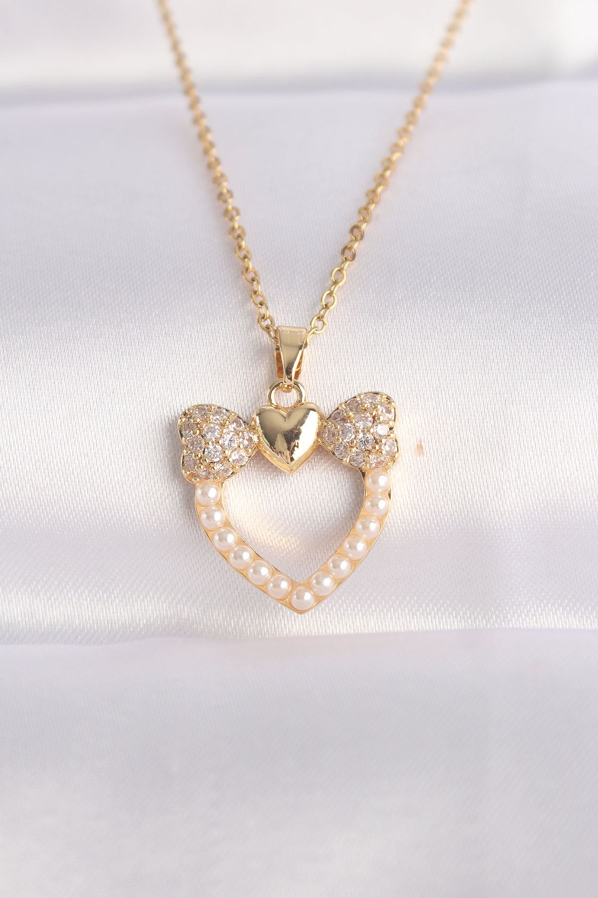 YRTCL 316L Çelik Zincir Altın Renk İnci Taş Detay Zirkon Taşlı Kalp Kolye